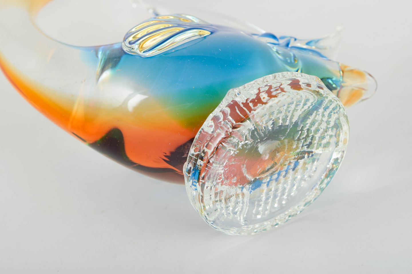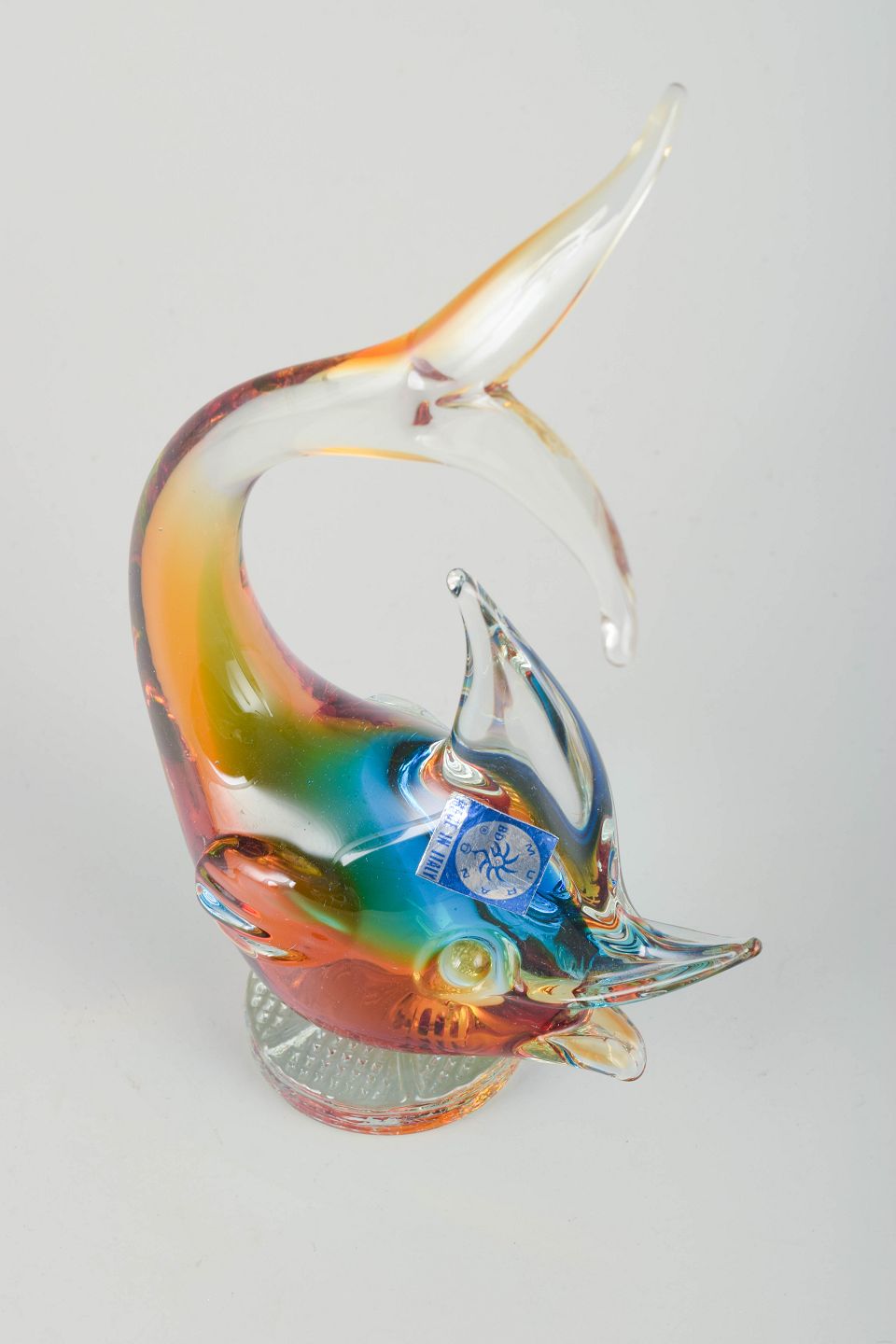 Håndlavet italiensk glasskulptur i form af en springende fisk i klart glas med flerfarvede indlagte nuancer i blå, rød, orange og grøn – et klassisk eksempel på Murano-arbejde fra perioden. Skulpturen har en elegant, dynamisk form og er udført med høj håndværksmæssig kvalitet.
