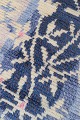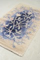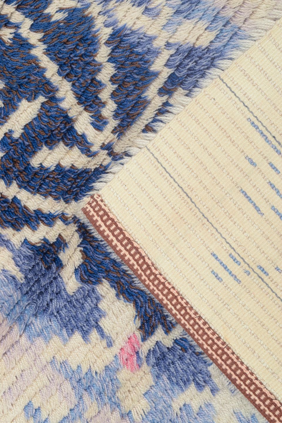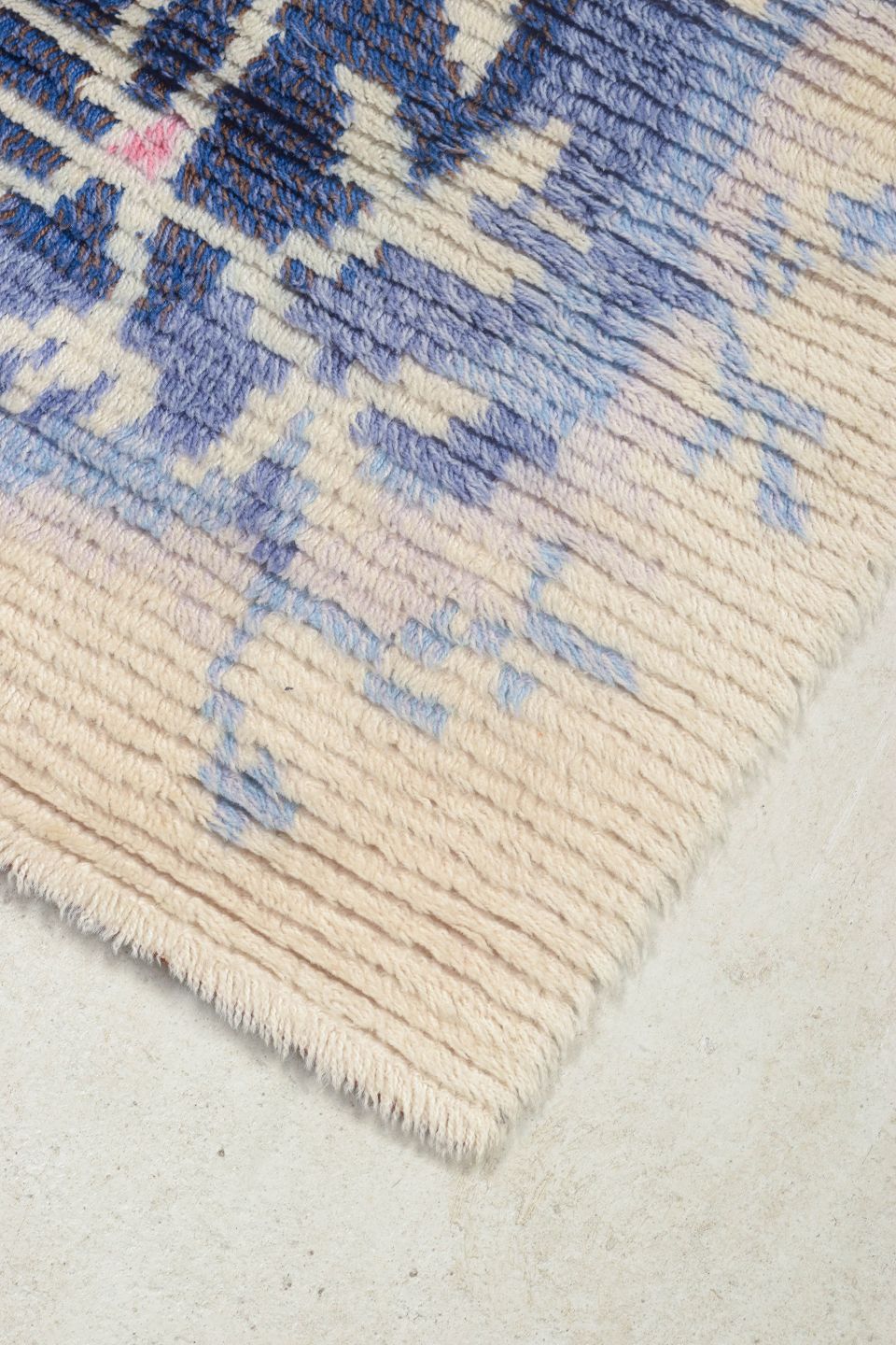 Håndknyttet rya-tæppe i uld med blomsterinspireret motiv i blå og rosa nuancer på lys bund. Et elegant og dekorativt tekstil, typisk for skandinavisk design i perioden, hvor naturmotiver og bløde farveovergange blev anvendt til at skabe varme og harmoni i indretningen.