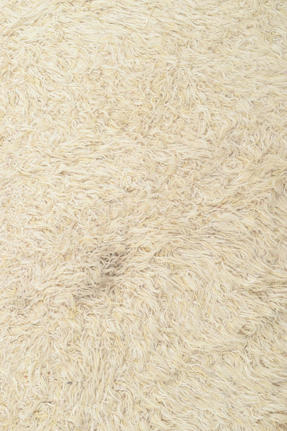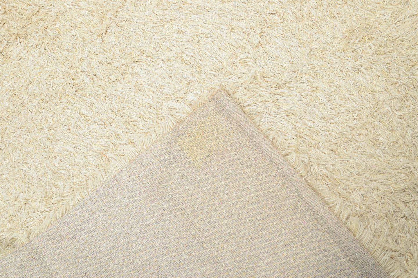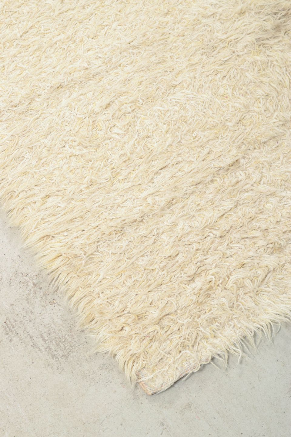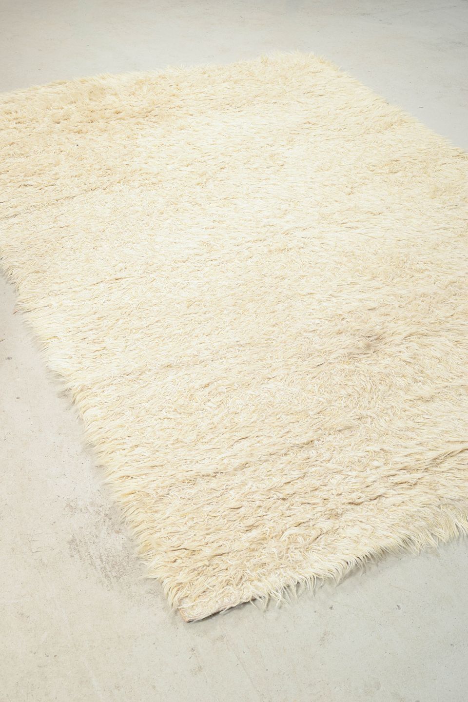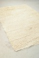 Håndknyttet rya-tæppe i naturhvid uld, fremstillet af Blekinge Rya. Et tidstypisk skandinavisk design med tæt luv og minimalistisk udtryk, der fremhæver materialets tekstur og varme. Tæppet repræsenterer den enkle elegance og høje håndværkskvalitet, som kendetegnede svensk tekstilproduktion i perioden.