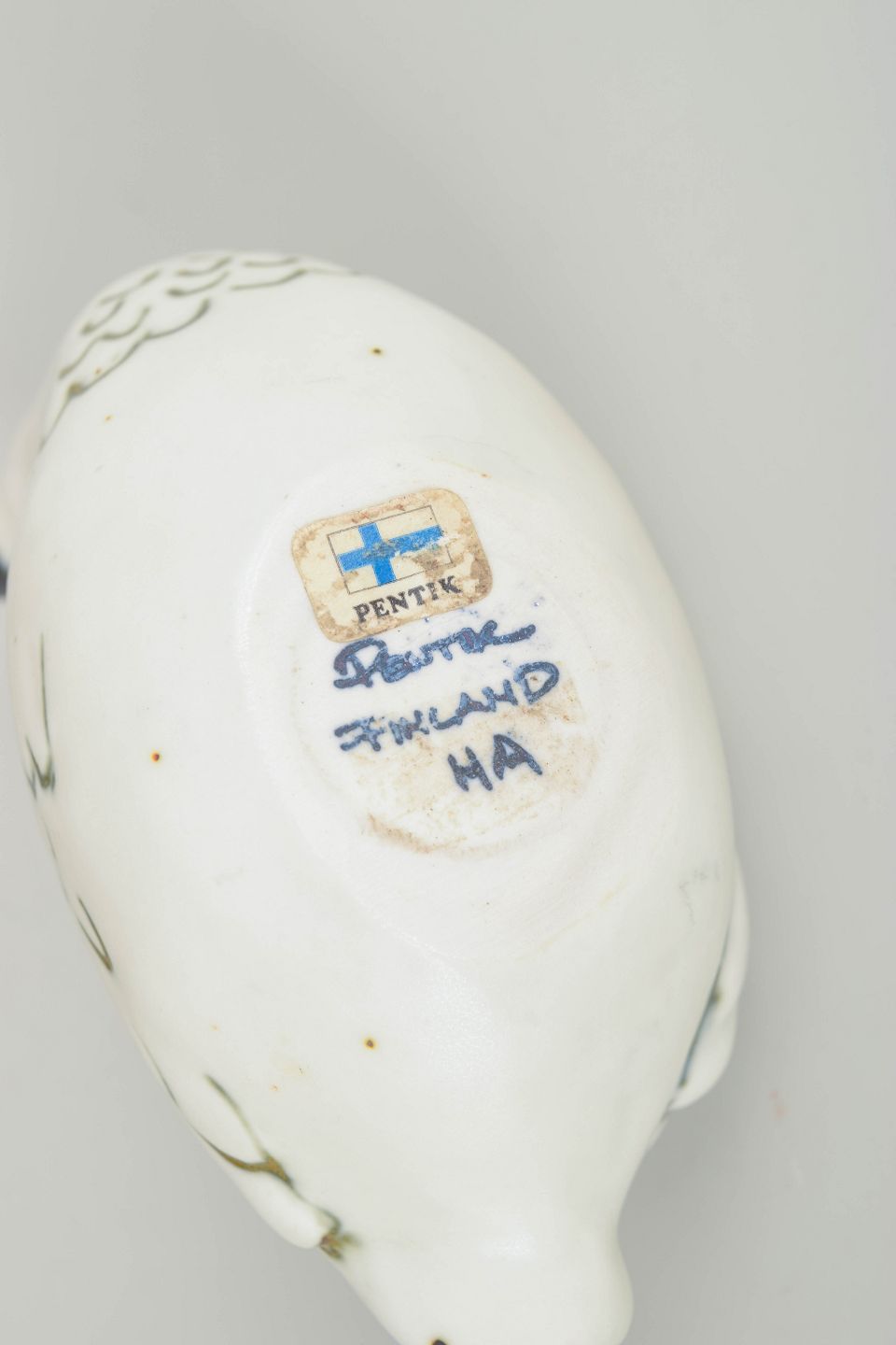 Skulpturel fuglefigur i glaseret stentøj, formet med bløde linjer og enkel dekor i grønne og sorte penselstrøg. Typisk for Allerts organiske formsprog og naturinspirerede udtryk.