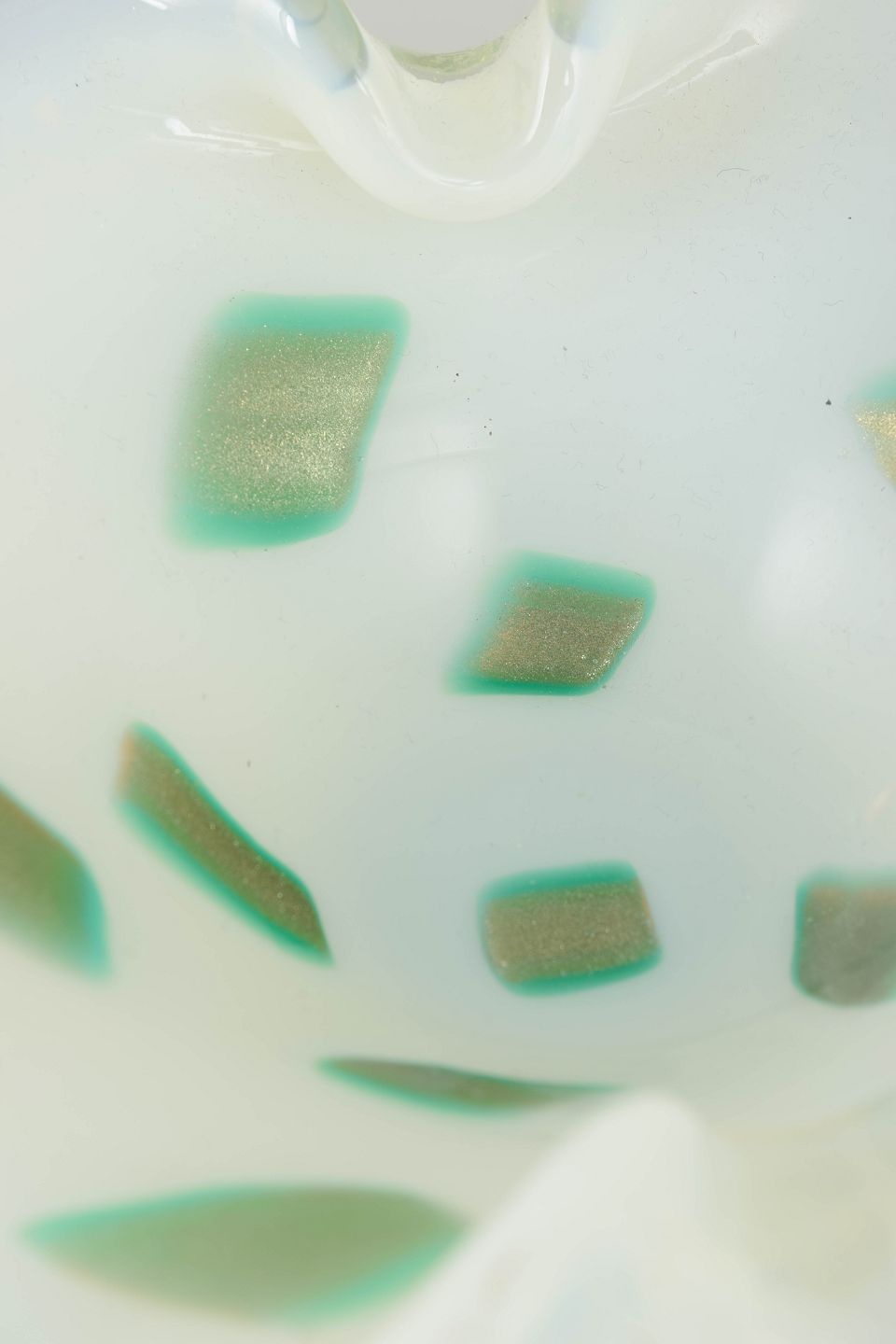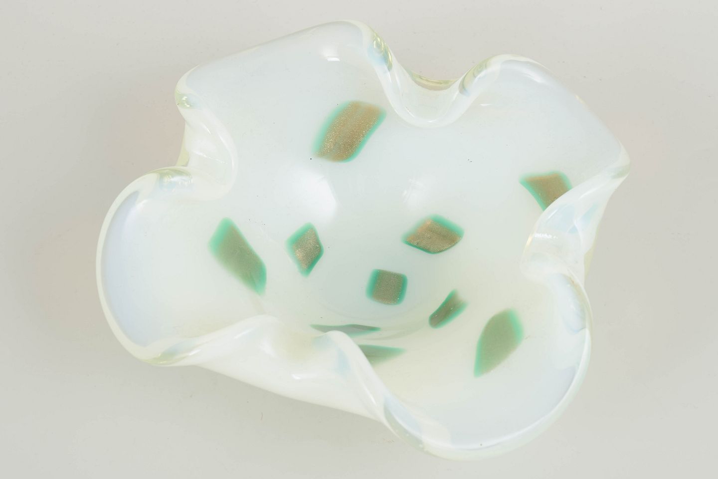 Organisk formet art glass-skål i håndblæst glas med iriserende overflade i opalhvide og grønne nuancer. Den bølgende form og de indsmeltede farvefelter giver skålen et karakteristisk udtryk, typisk for Murano-glas fra perioden.