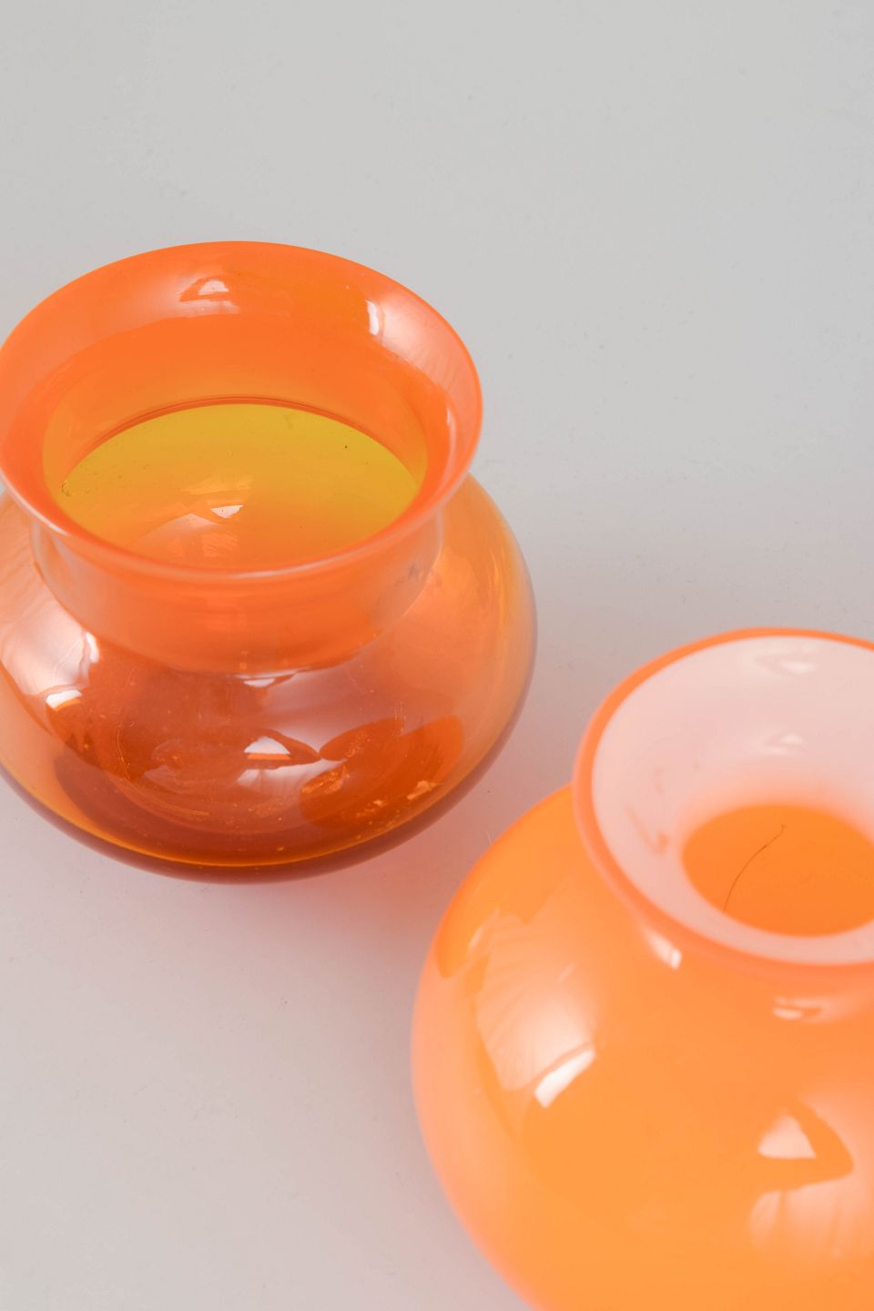 To mundblæste vaser i levende orange glas med blød, rund form og let indsnævret hals. Klassiske eksempler på skandinavisk glasdesign fra perioden med karakteristisk 70’er-farvespil og håndværksmæssig kvalitet.