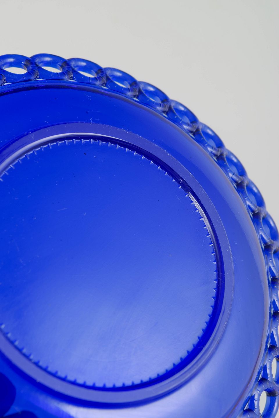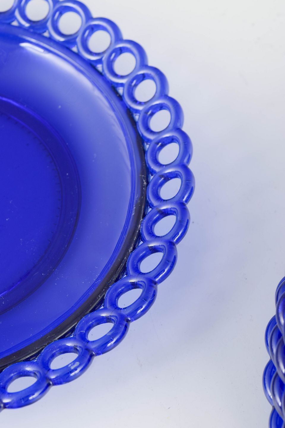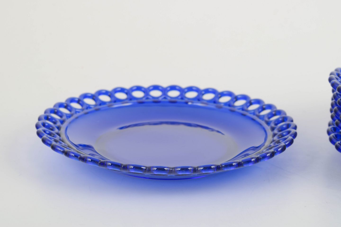 Smukke asietter i dyb koboltblå glas med dekorativ gennembrudt kant i typisk Gullaskruf design. Elegant svensk glasarbejde med klassisk farvet glas, der viser fabrikkens håndværksmæssige kvalitet og formsprog.