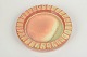 Lavt, cirkulært keramikfad med karakteristisk reliefkant og glasur i rosa, grønne og gyldne toner. Et smukt eksempel på svensk Art Deco-keramik fra Höganäs, hvor dekorativ formgivning og eksperimenterende glasurer blev kombineret i funktionelle hverdagsobjekter.