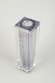 Optisk vase udført i massivt klart glas med indlagt spiralformet sort mønster, slebne og polerede flader. Et sofistikeret eksempel på Lindstrands sene design for Kosta Boda, hvor teknisk præcision og visuel bevægelse mødes i et skulpturelt formsprog.