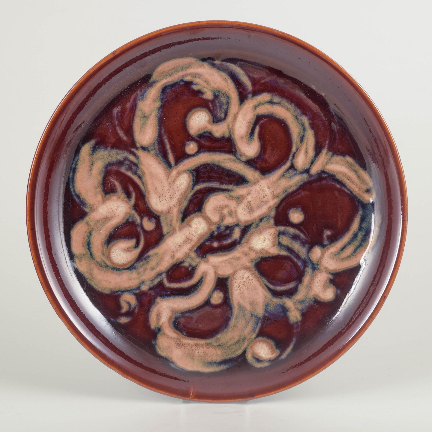 Hand-thrown stoneware dish with an experimental multicoloured glaze in shades of wine red, pink, and blue. The surface features a free ornamental pattern typical of Stålhane’s later work, where the glaze forms a dynamic, relief-like structure with a glossy finish. A striking example of his post-Rörstrand production at Designhuset.