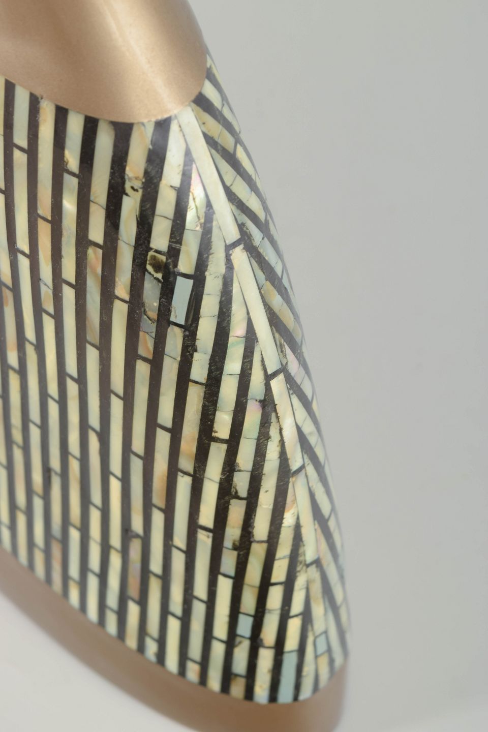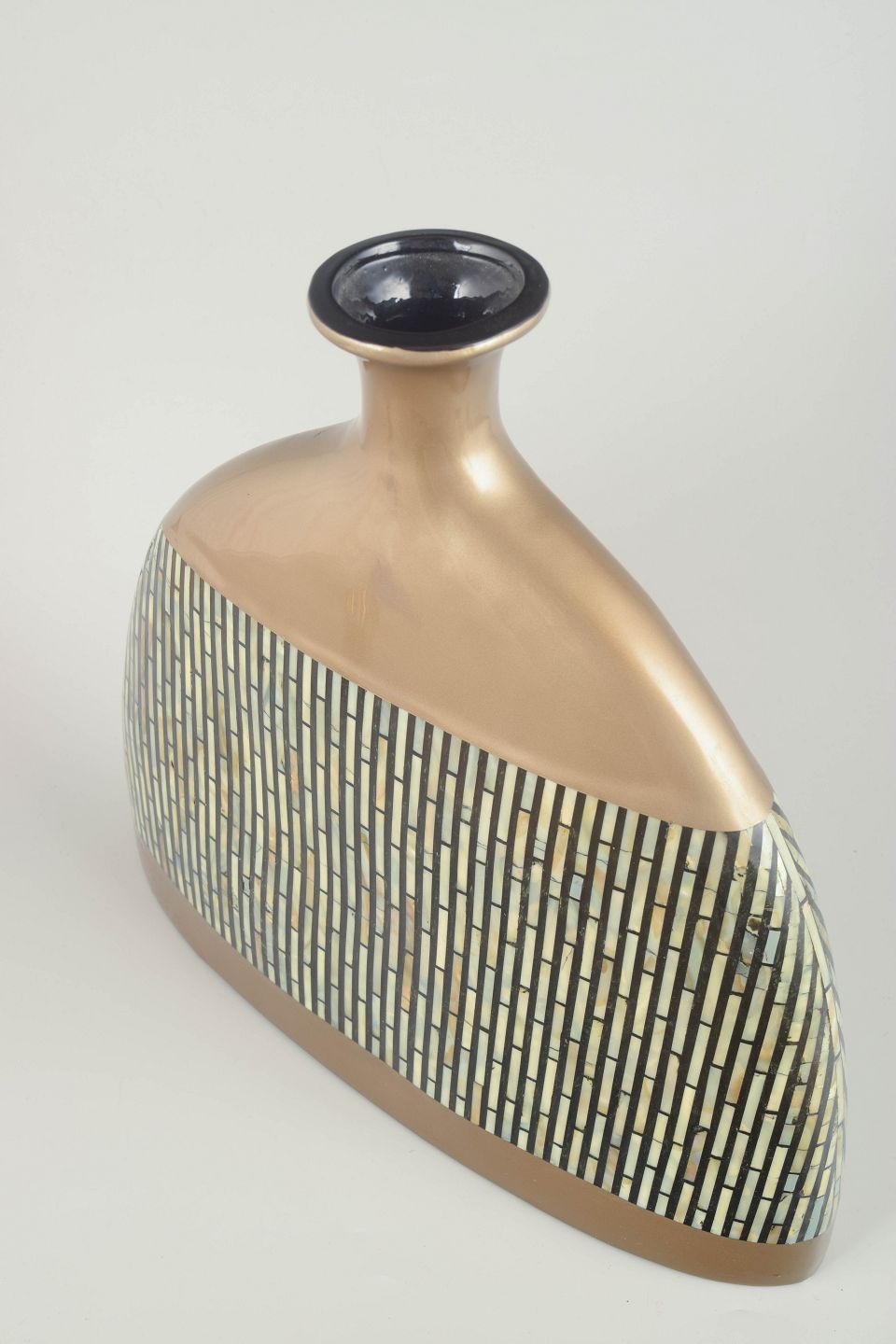 Impressive, sculptural studio vase in glazed ceramic with geometric mosaic decoration in metallic and light tones. The wide, asymmetrical form and reflective glaze give the piece a striking, decorative presence typical of European studio ceramics of the 1980s.