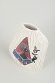 Håndlavet italiensk keramikvase med asymmetrisk, skråtformet krop og reliefdekoreret overflade i hvidglaseret ler. Fronten er udsmykket med et farverigt motiv af en stiliseret figur med blomst, udført i emalje og malet i rød, blå, grøn og sort. Signeret på undersiden. Et karakteristisk eksempel på italiensk 1960’er-keramik med kunstnerisk og grafisk udtryk.