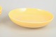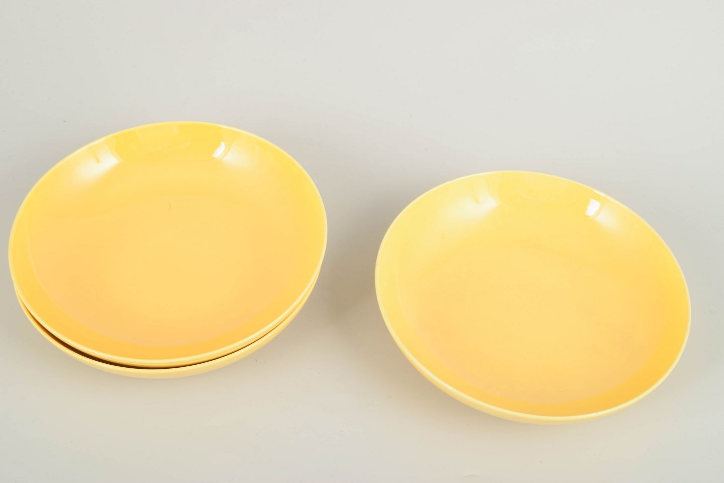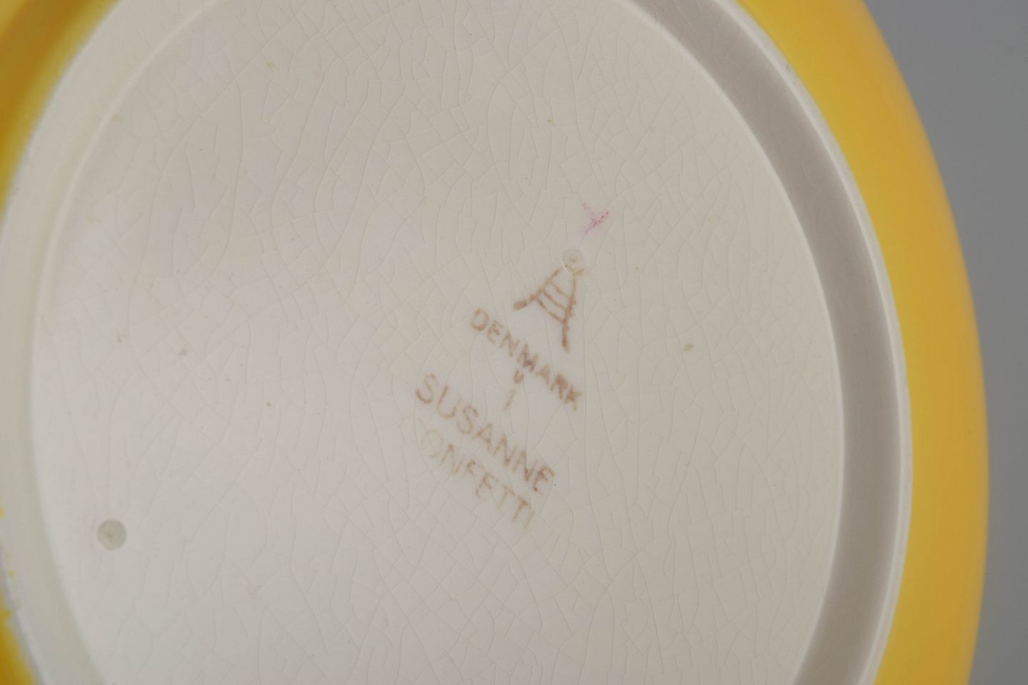 Tre store dybe tallerkener i fajance fra Aluminia, model “Susanne” i den ikoniske gule “Confetti”-glasur. En klassiker i dansk hverdagsporcelæn med et let og farverigt udtryk typisk for perioden.