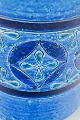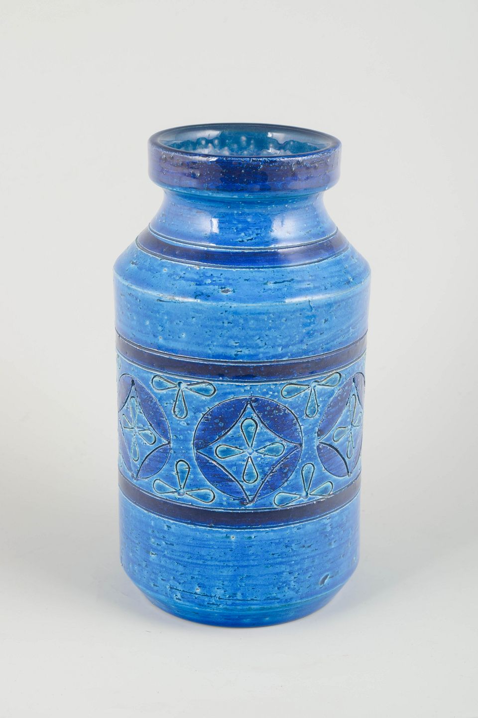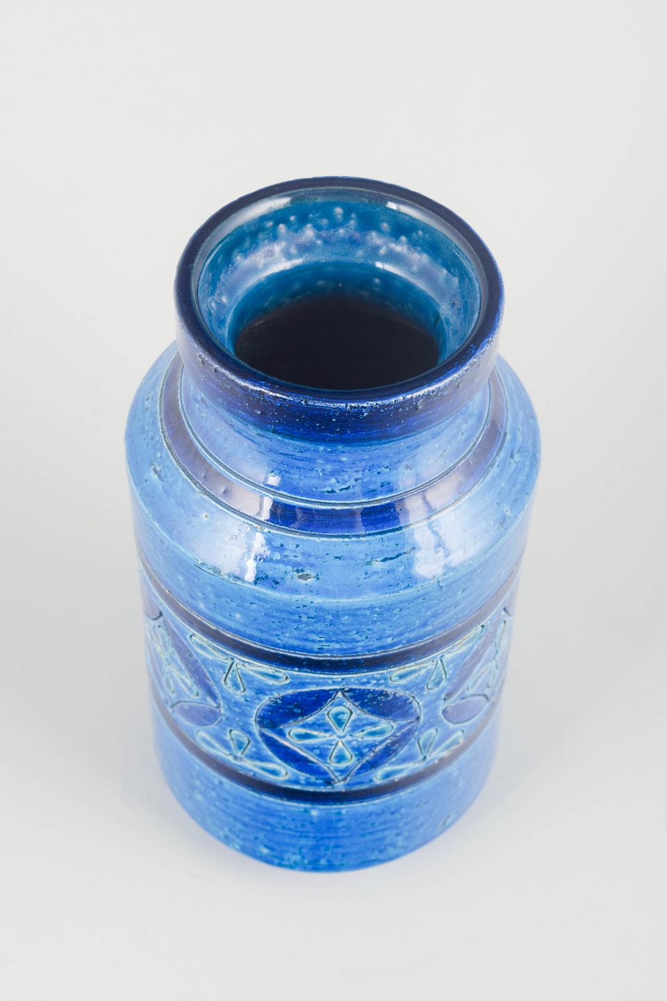 Tall cylindrical ceramic vase with relief decoration and the characteristic “Rimini Blu” glaze in rich blue and turquoise tones. The hand-glazed surface features geometric motifs and brown accent bands, enhancing the vibrant play of colour and texture typical of the series. A classic example of Aldo Londi’s iconic design for Bitossi.