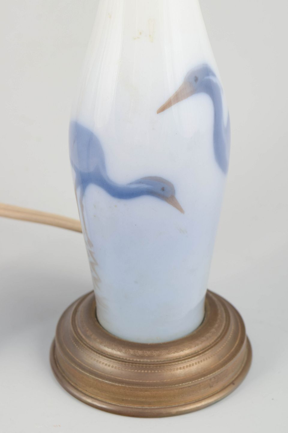 Et par elegante bordlamper med håndmalede motiver af hejrer i blå toner på hvidt porcelæn, monteret med originale fatninger og detaljer i patineret messing. Klassisk design med tidlig 1900-tals æstetik.