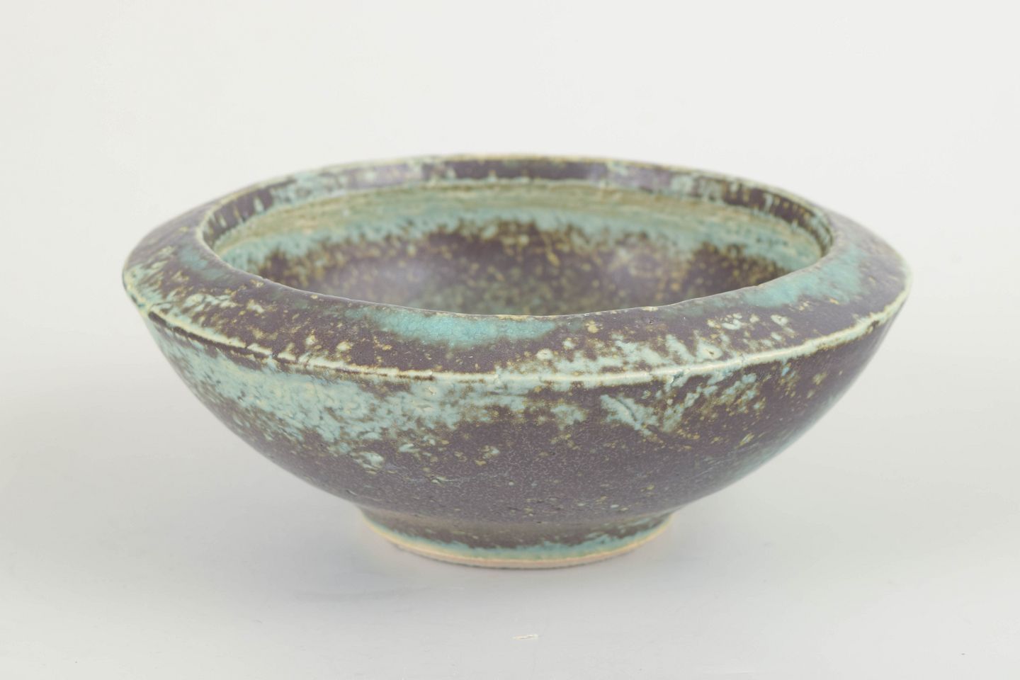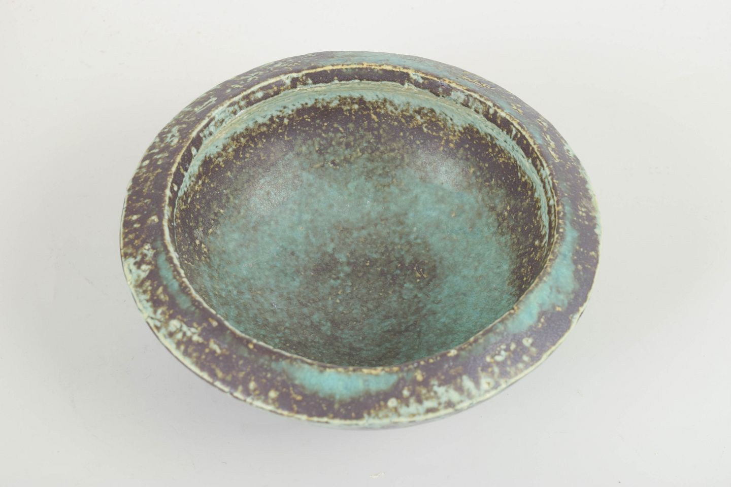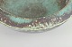 Hånddrejet stentøjsskål med bred, afrundet kant og levende blågrøn glasur over mørk brunlig bund.