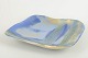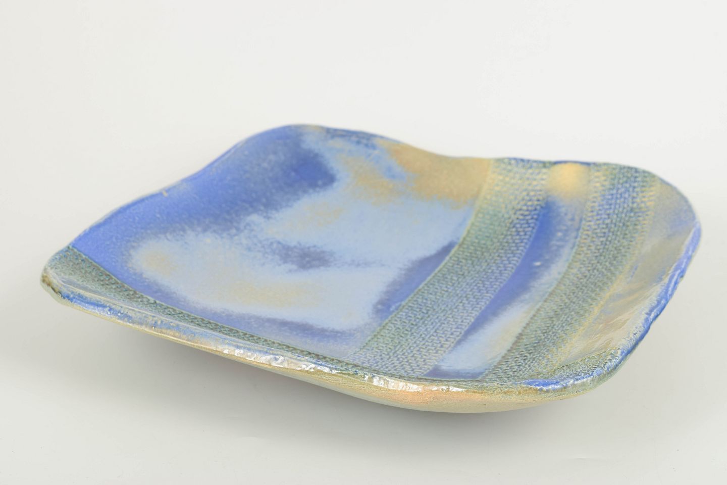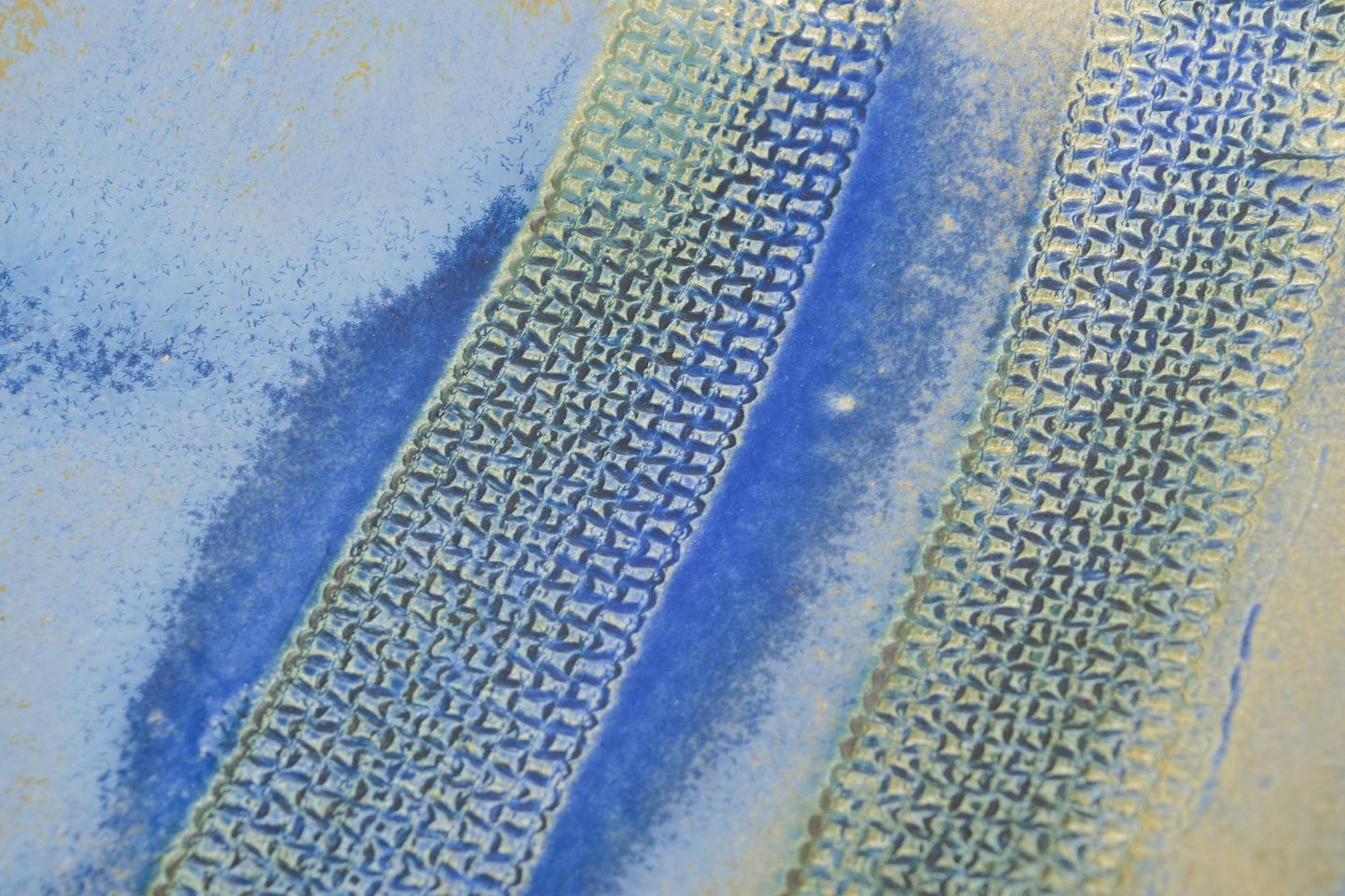 Håndlavet kvadratisk vægrelief i stentøj med eksperimenterende glasur i blå, grønne og gyldne toner. Dekoreret med reliefmønstre og glaserede felter i geometrisk komposition.