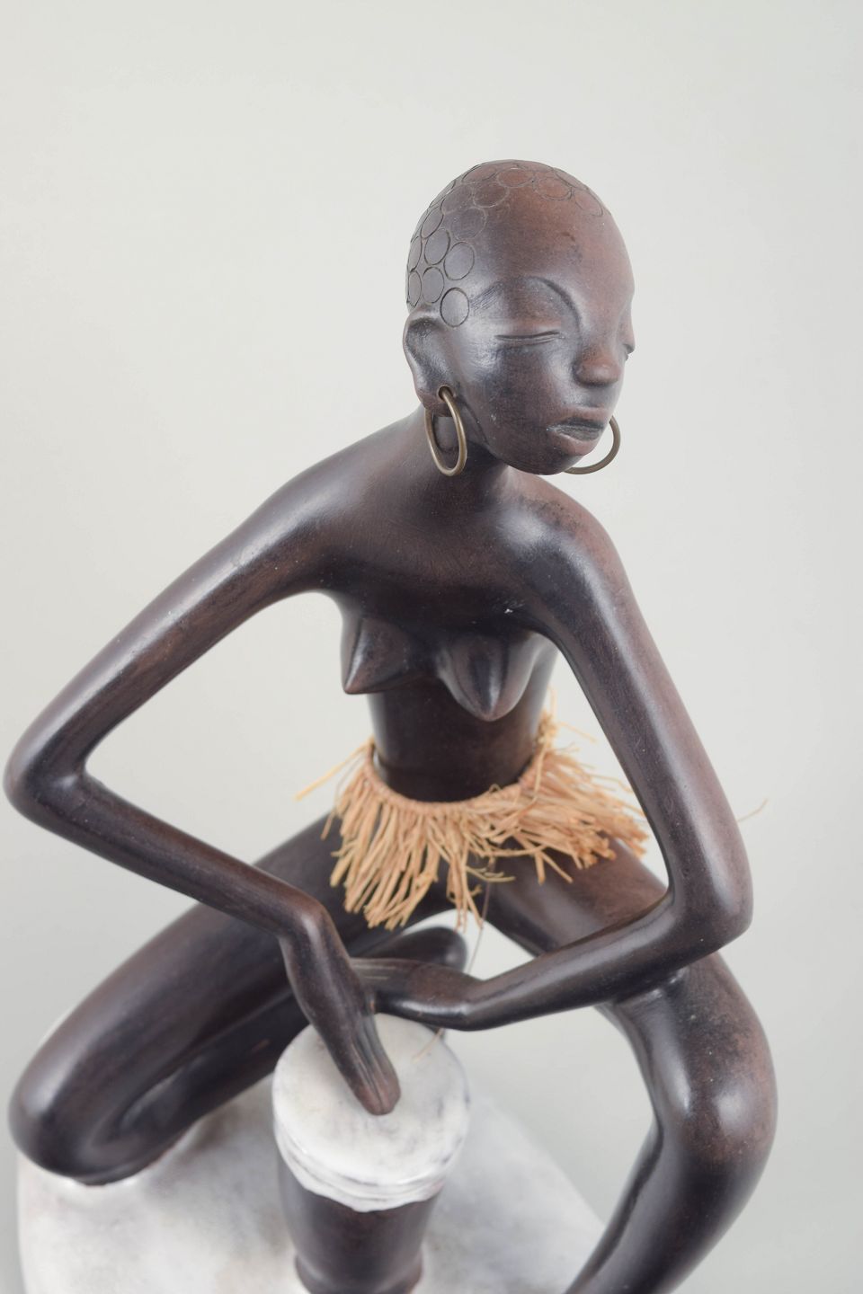 Large ceramic figure of a kneeling woman with drum, in dark brown glaze with white base and straw skirt. Typical of Anzengruber’s exoticized figurative style of the period.