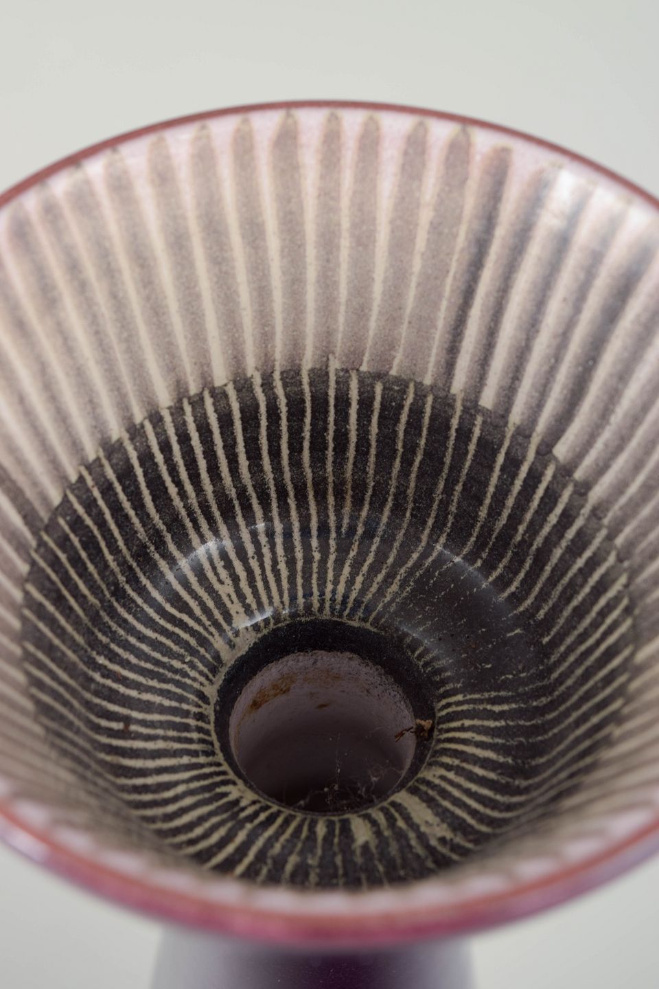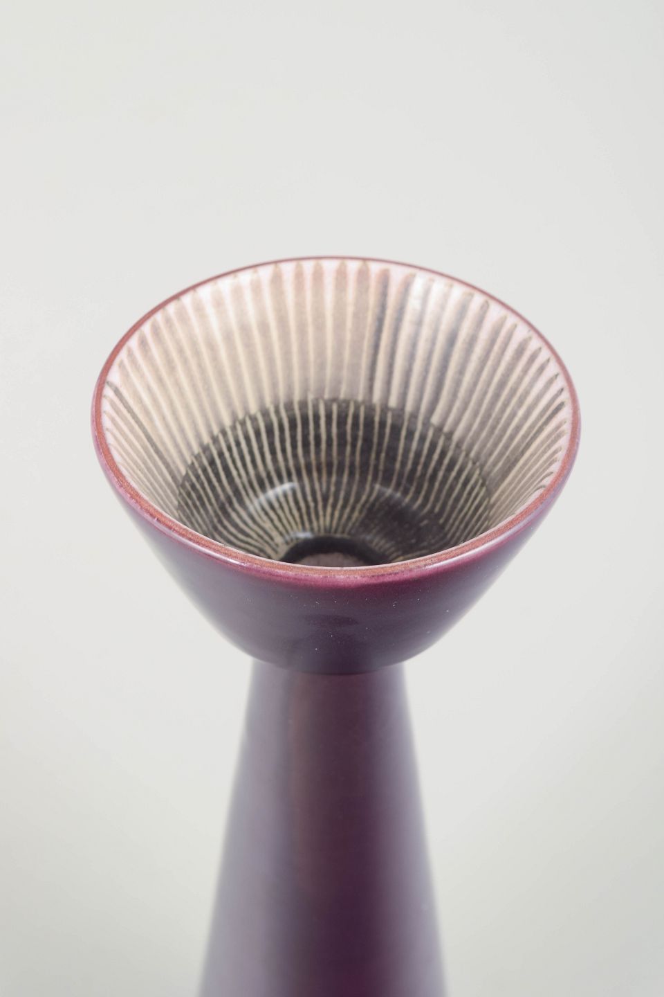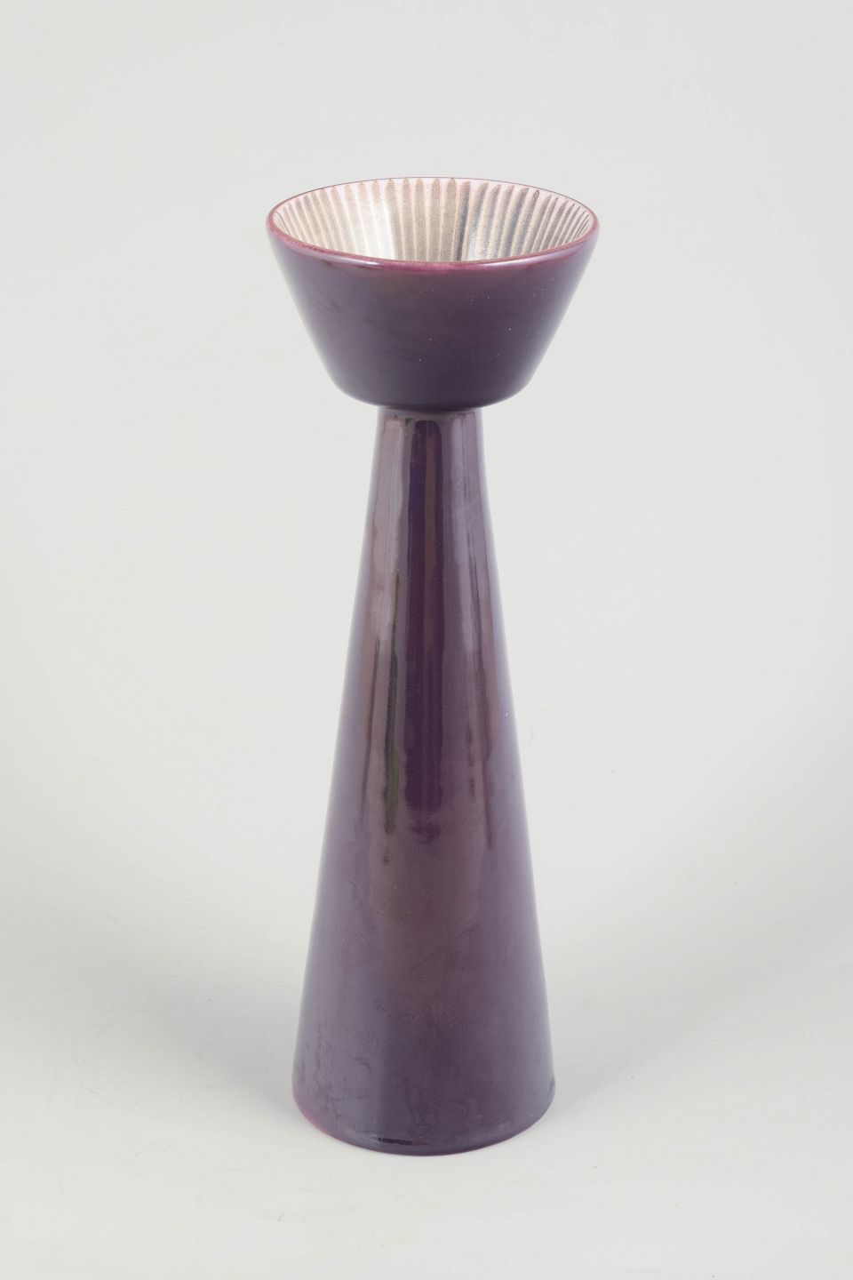 Sculptural conical vase in deep purple glaze with a fluted, bowl-shaped opening in contrasting light tones. A striking decorative 1960s design with Simmulson’s characteristic expression.