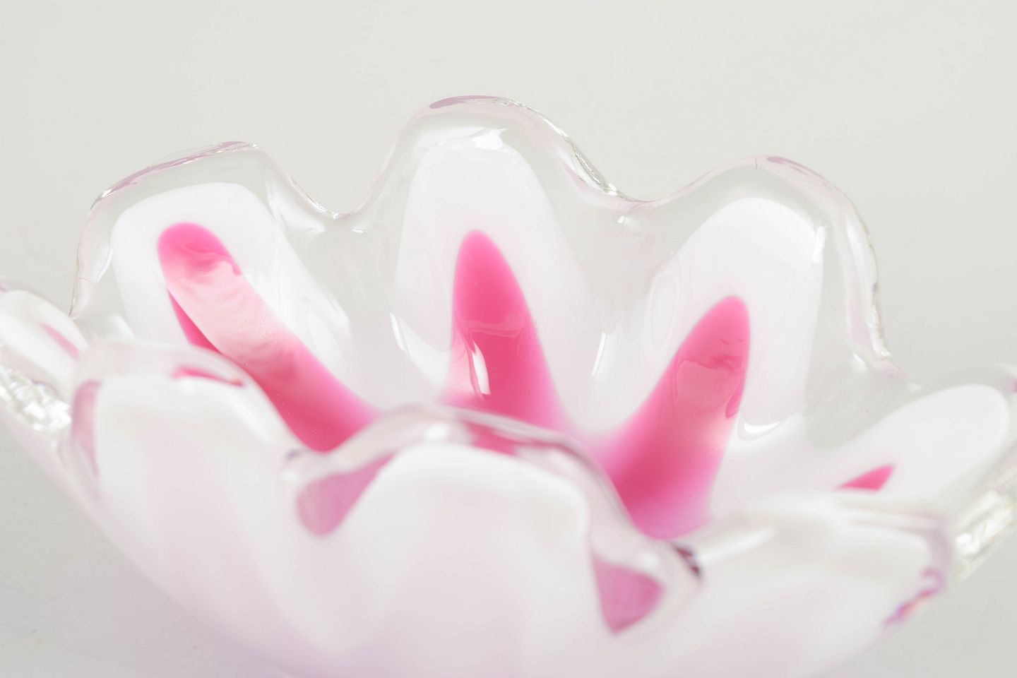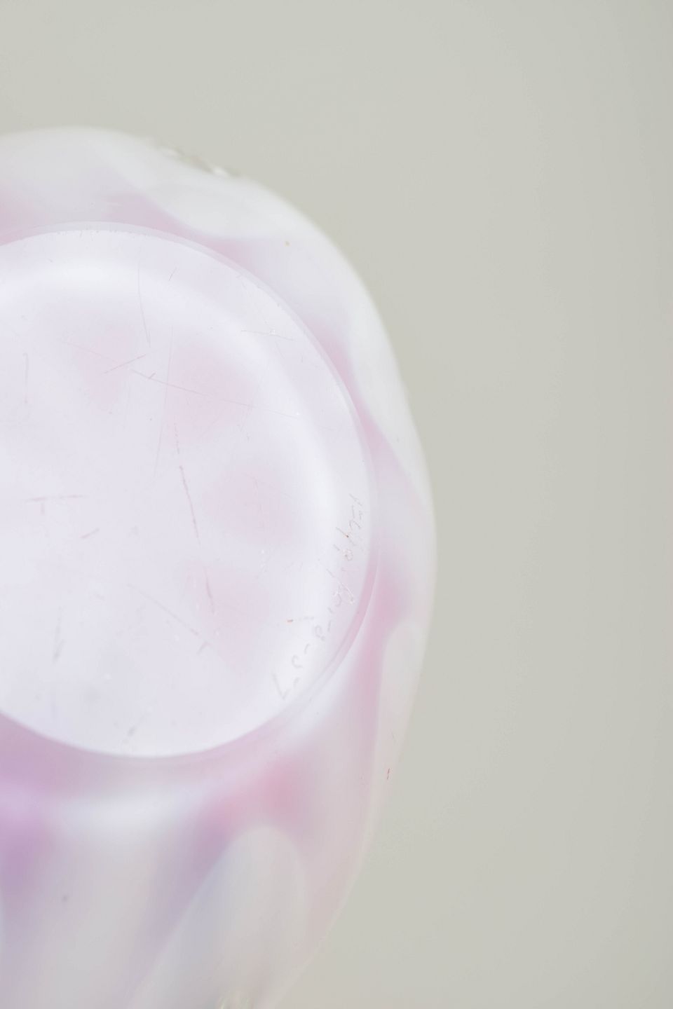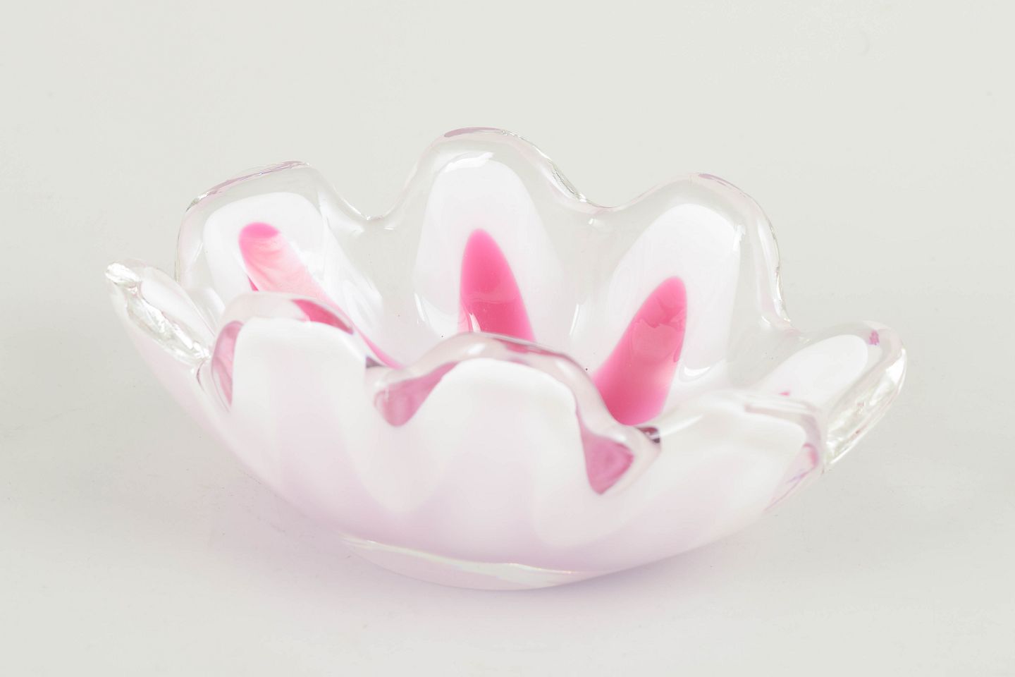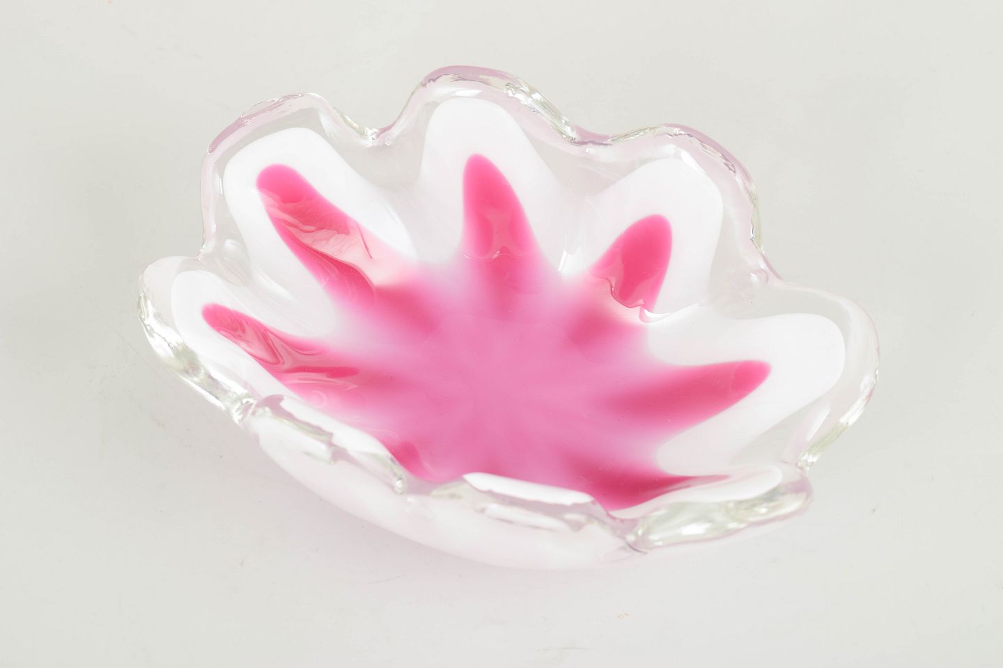 Dekorativ “Coquille”-skål i flerlaget kunstglas med rosa indre farvespil, hvidt mellemlag og klart yderste glas. Den bølgede, blomsterlignende form repræsenterer en af Kedelvs mere skulpturelle variationer inden for serien.