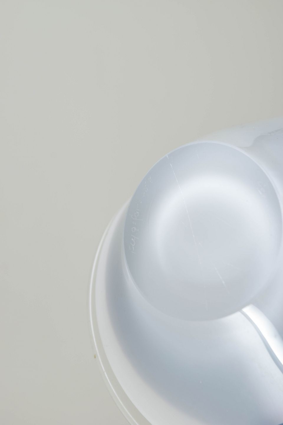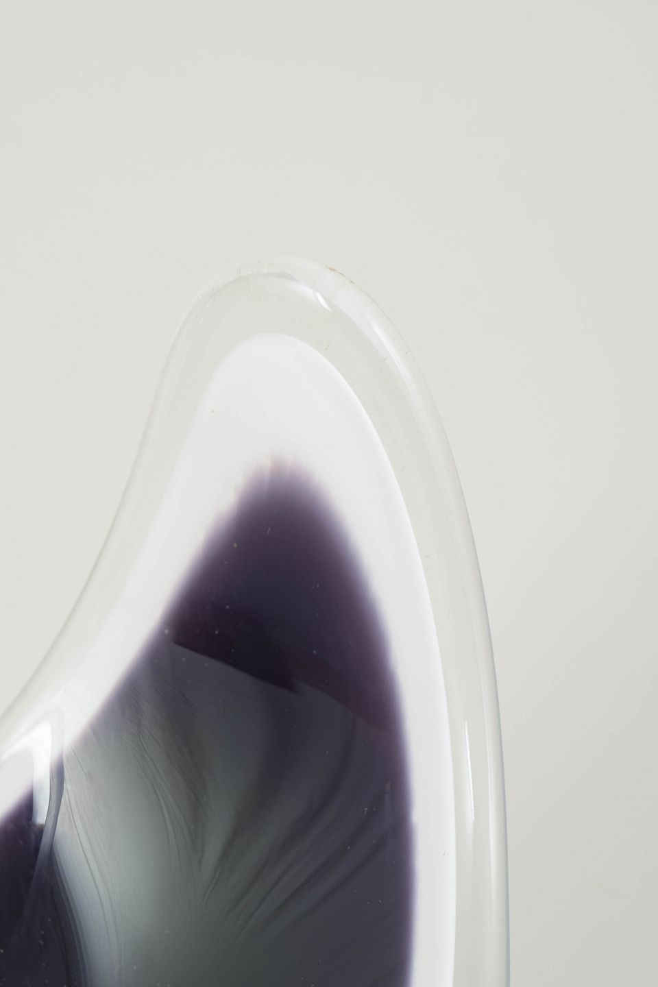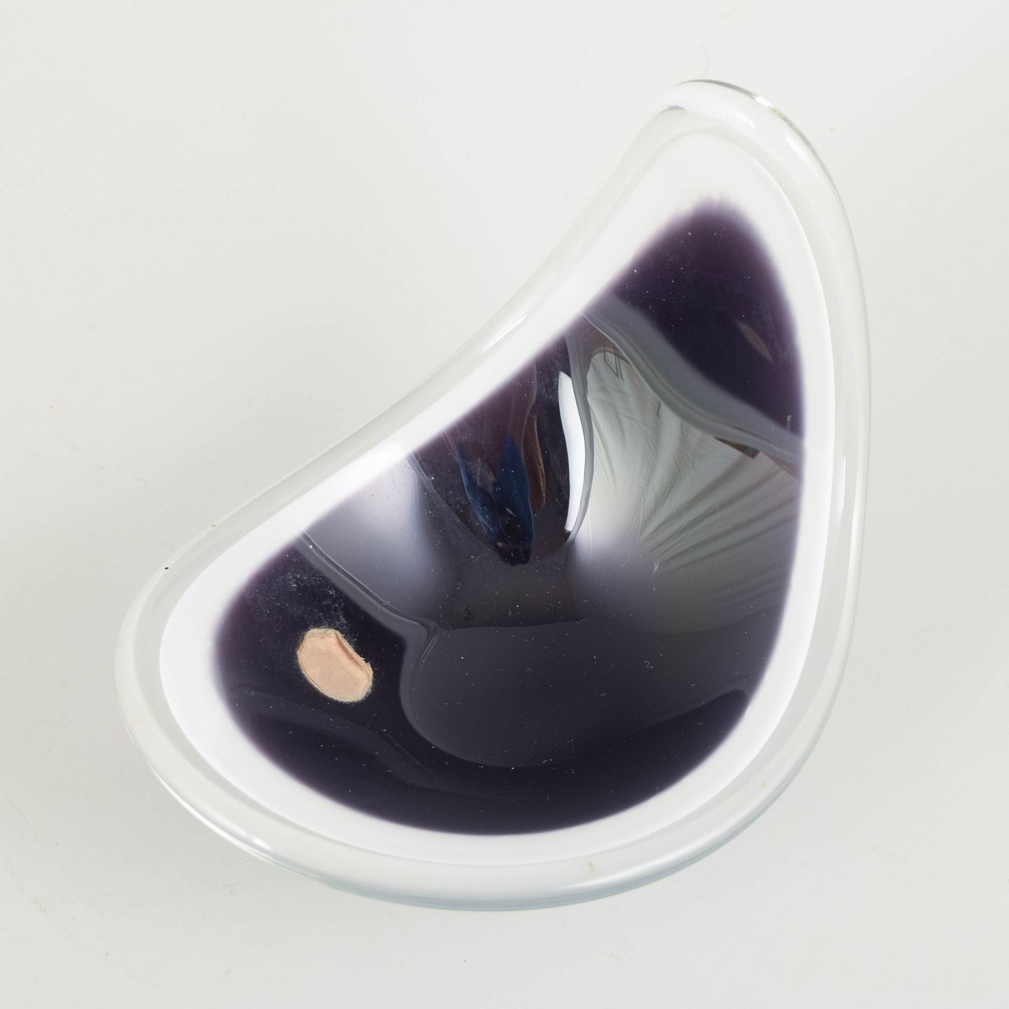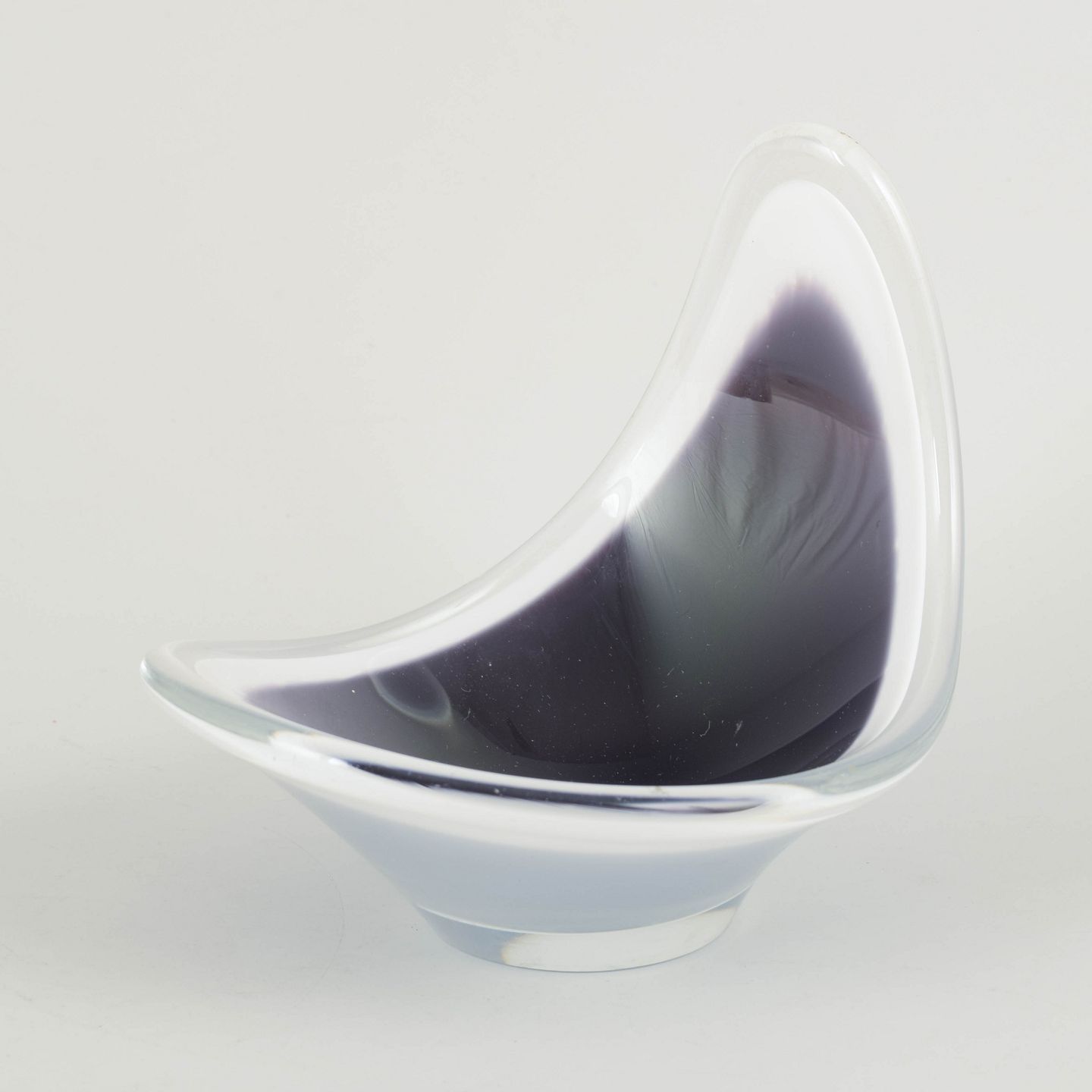 “Coquille”-skål i flerlaget kunstglas med dyb grå/sort indfarvning og hvidt mellem­lag, omsluttet af klart yderglas. Den asymmetriske, opadbuede form er karakteristisk for Kedelvs organiske mid-century design.