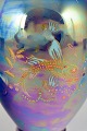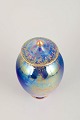Porcelain lidded jar with an iridescent blue-purple glaze, hand-painted goldfish motif, and refined gold accents on the lid and foot. A characteristic example of Crown Devon Fieldings’ decorative porcelain from the interwar period.