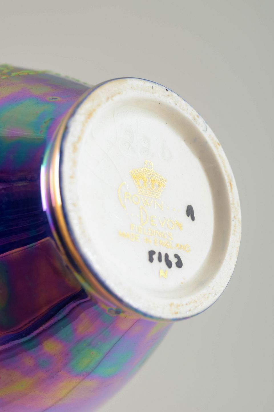 Crown Devon Fieldings was an English porcelain and ceramics manufacturer renowned for its vibrant glazes, luxurious iridescent finishes and hand-painted decorations. During the 1930s and 40s, the factory explored both Art Deco-inspired forms and richly ornamented designs, making their pieces highly collectible today.