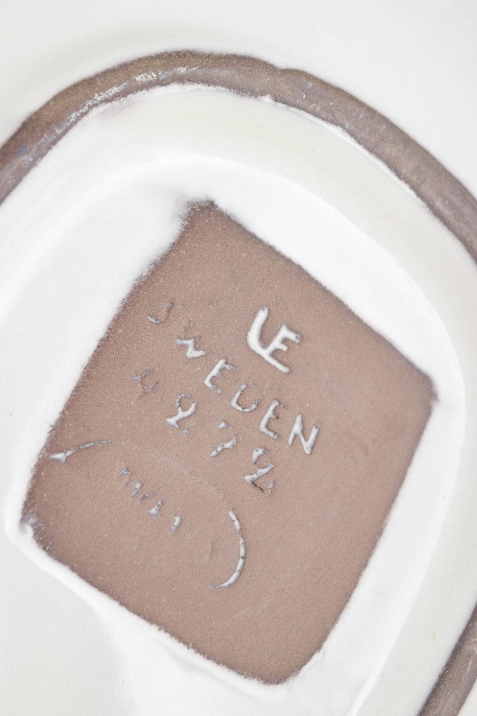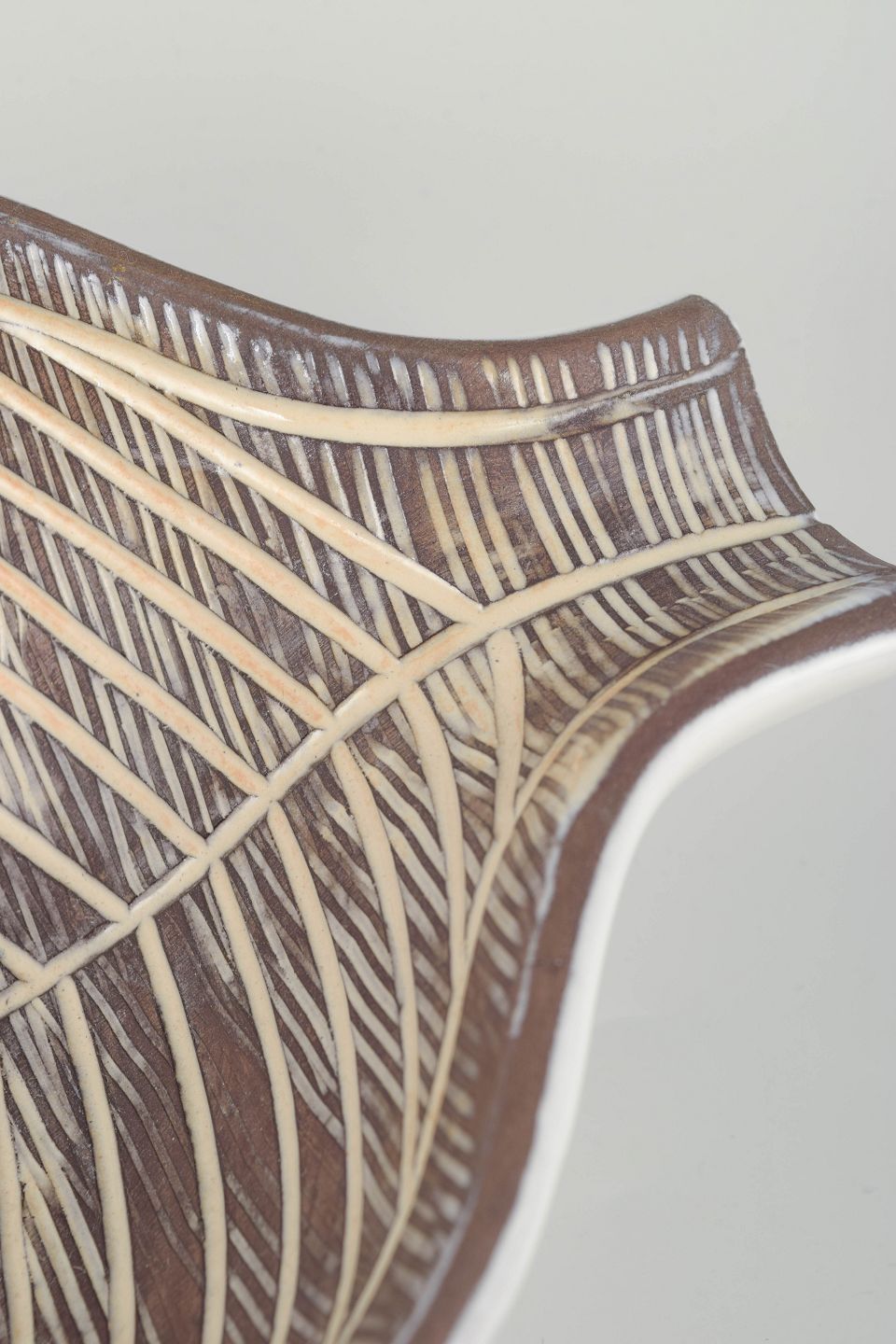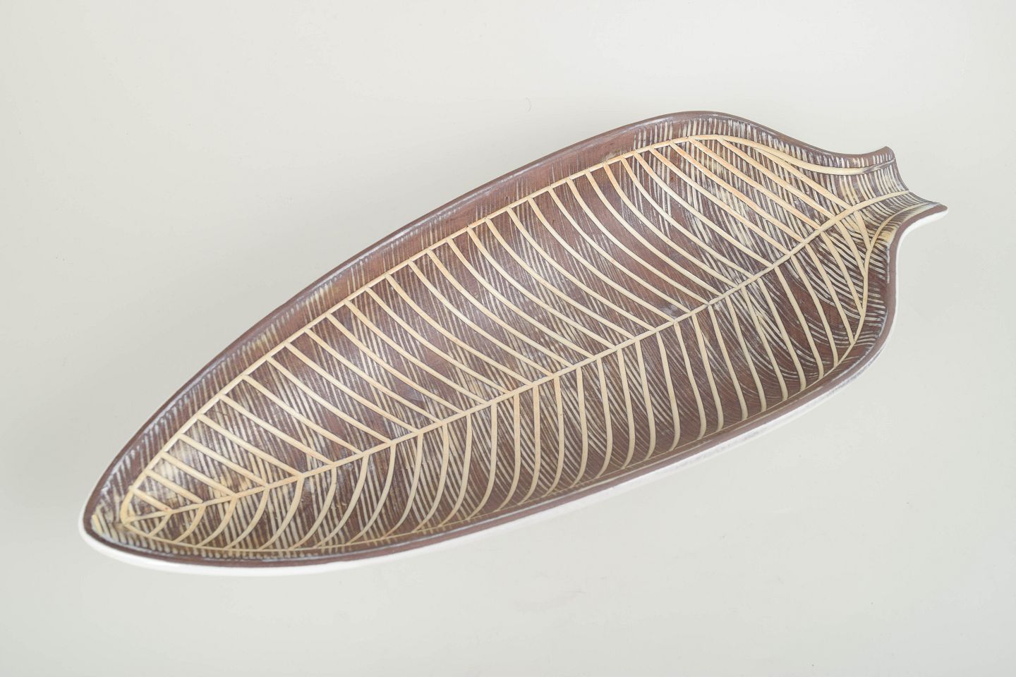 Very large leaf-shaped ceramic dish decorated with Simmulson’s characteristic incised pattern in light tones against a brown ground. Hand-painted with elegant, organic linework.