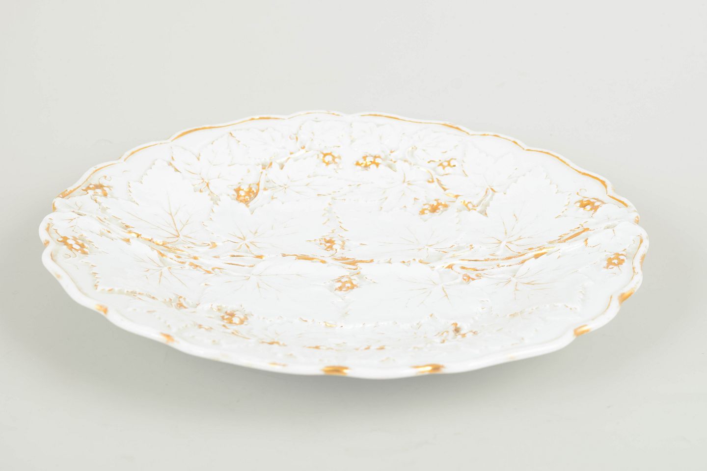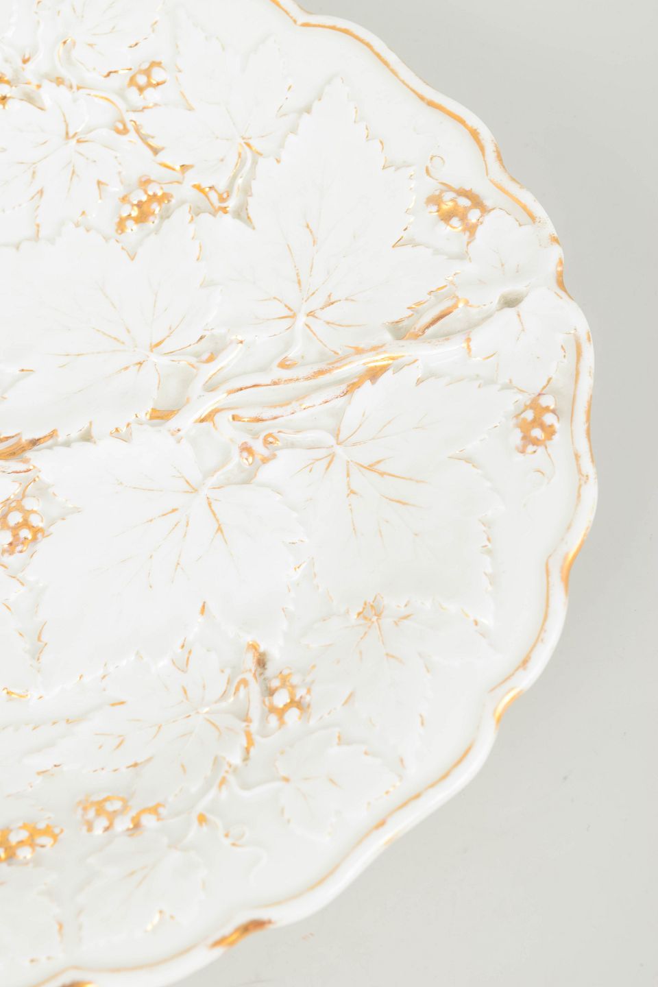 Porcelain dish by Meissen with relief-moulded leaf decoration and hand-painted gilt details. A refined late-19th-century piece with scalloped edges and delicate naturalistic motifs.