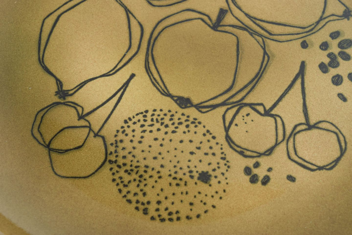 Ceramic dish with a graphic fruit motif in black on a mustard-yellow glaze – a characteristic example of Olin-Grönqvist’s playful line work and Arabia’s decorative design language of the era.