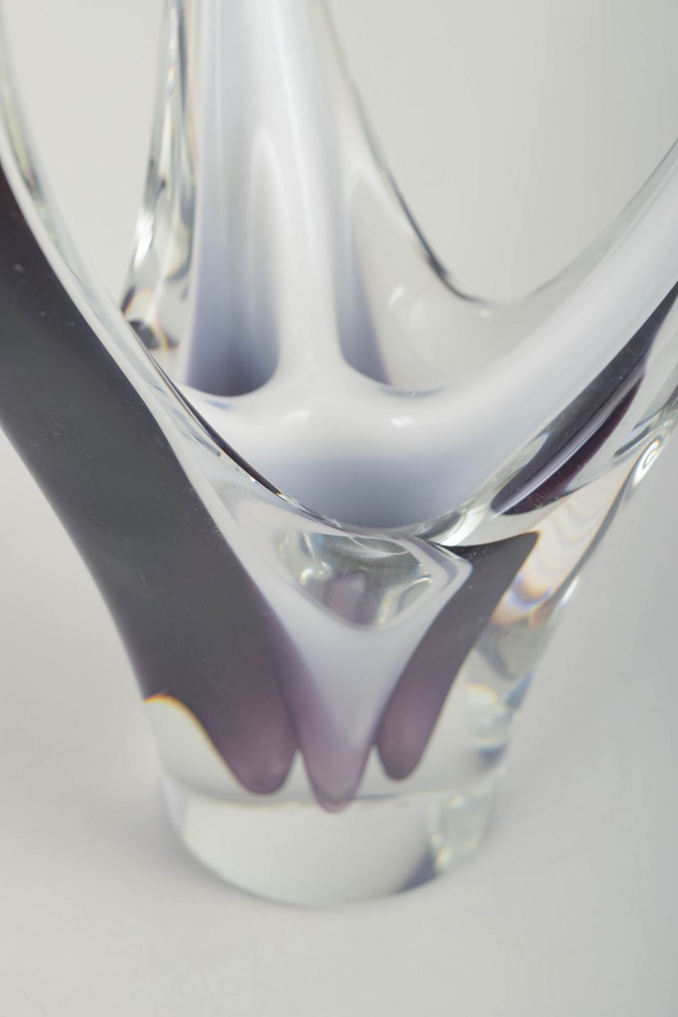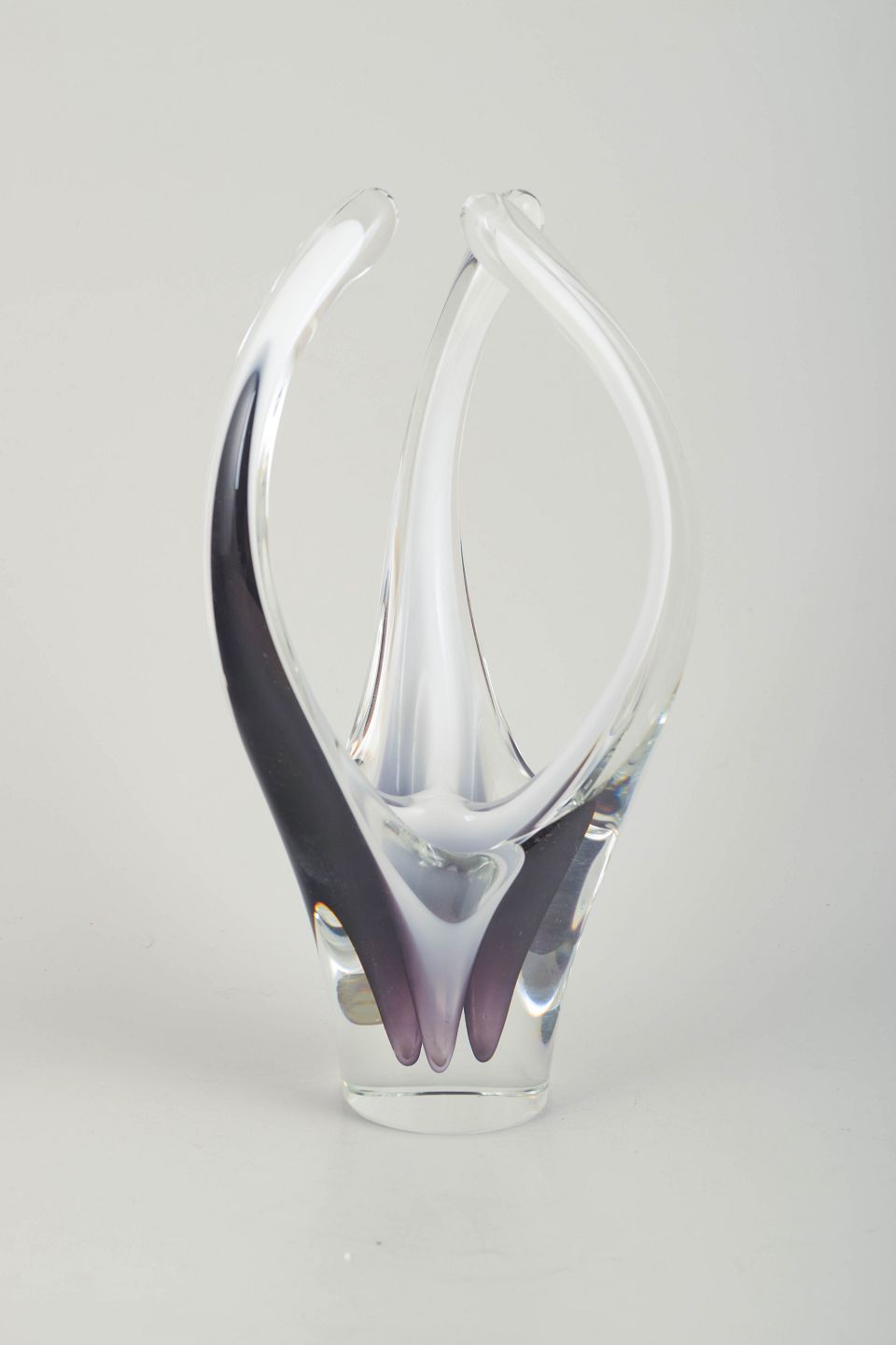Skulpturel, organisk kunstglas vase i klart glas med smukke lag i violet og hvid. Mundblæst i den klassiske opadstræbende Coquille-form, hvor de to øverste arme mødes i en elegant bue.