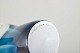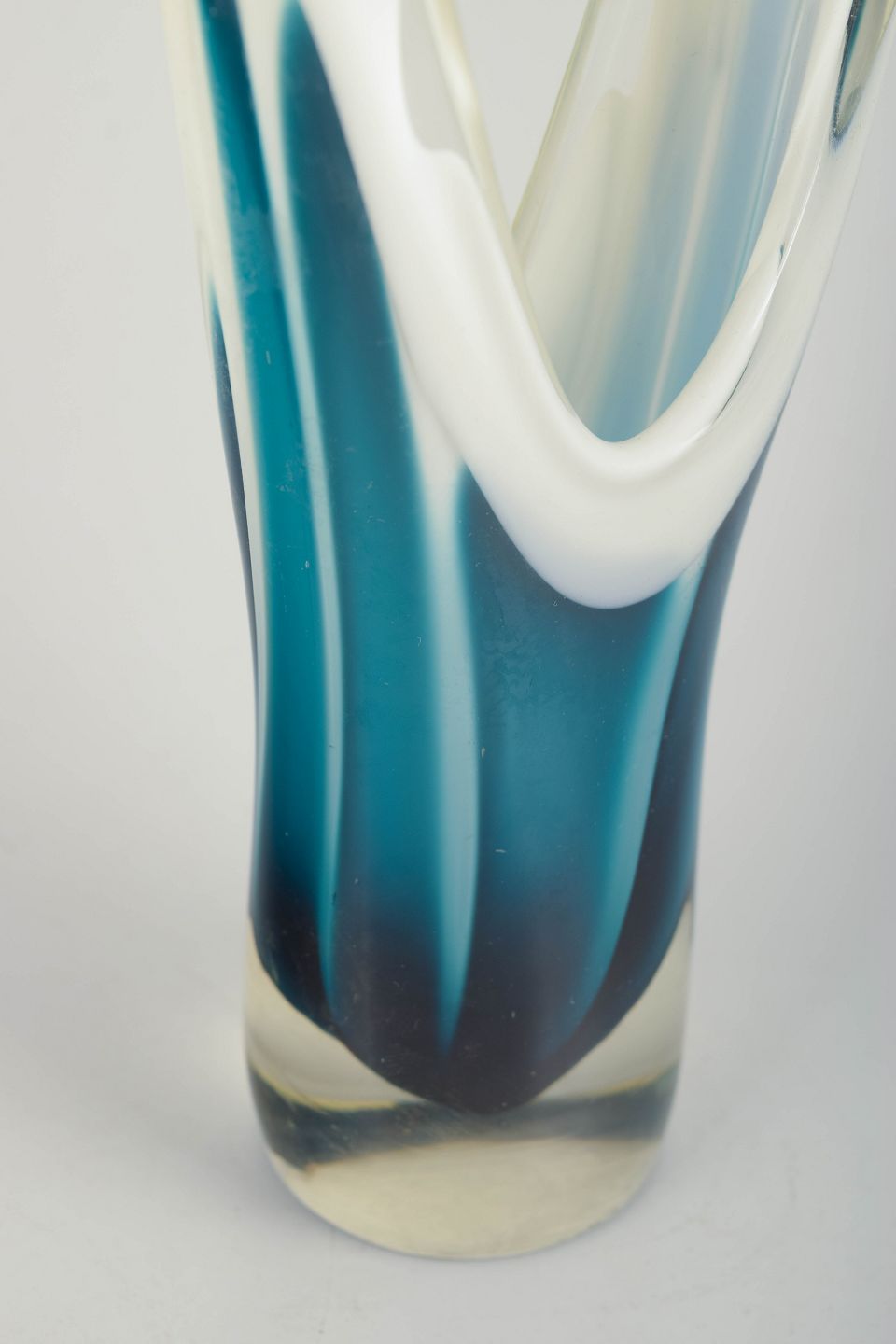 Elegant, organisk kunstglas vase i klart glas med lag i dyb turkis/blå og hvid. Mundblæst i den klassiske V-formede Coquille-silhuet, hvor farvelagene løber op i flydende, skulpturelle bevægelser.