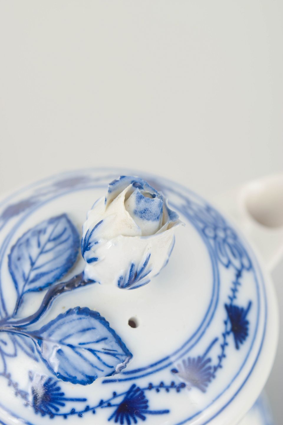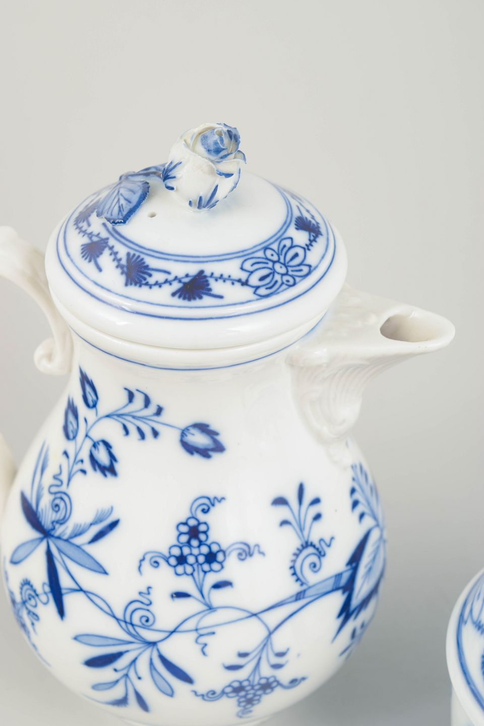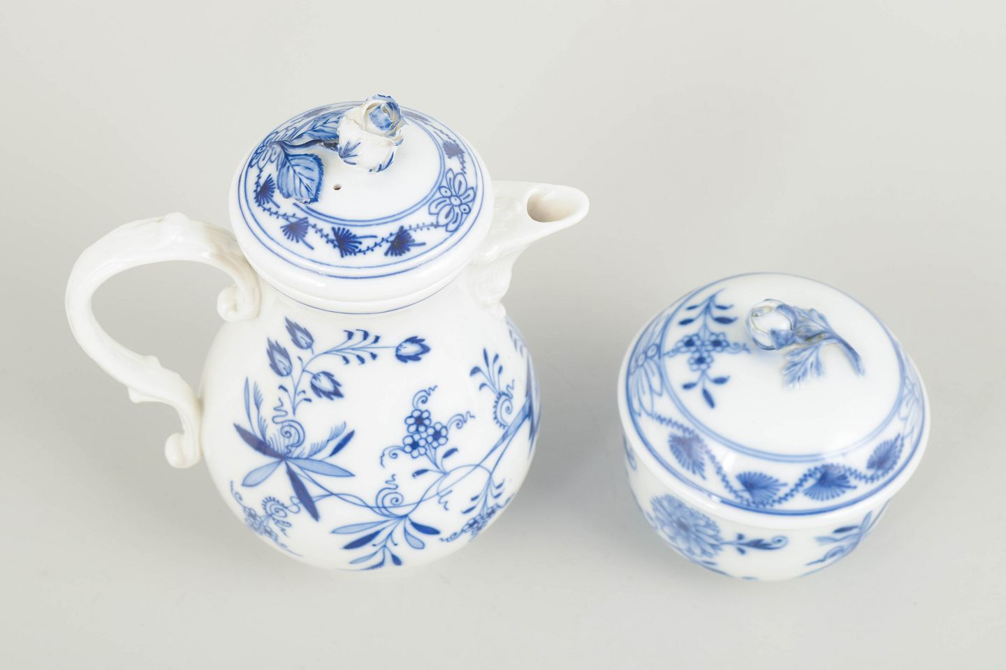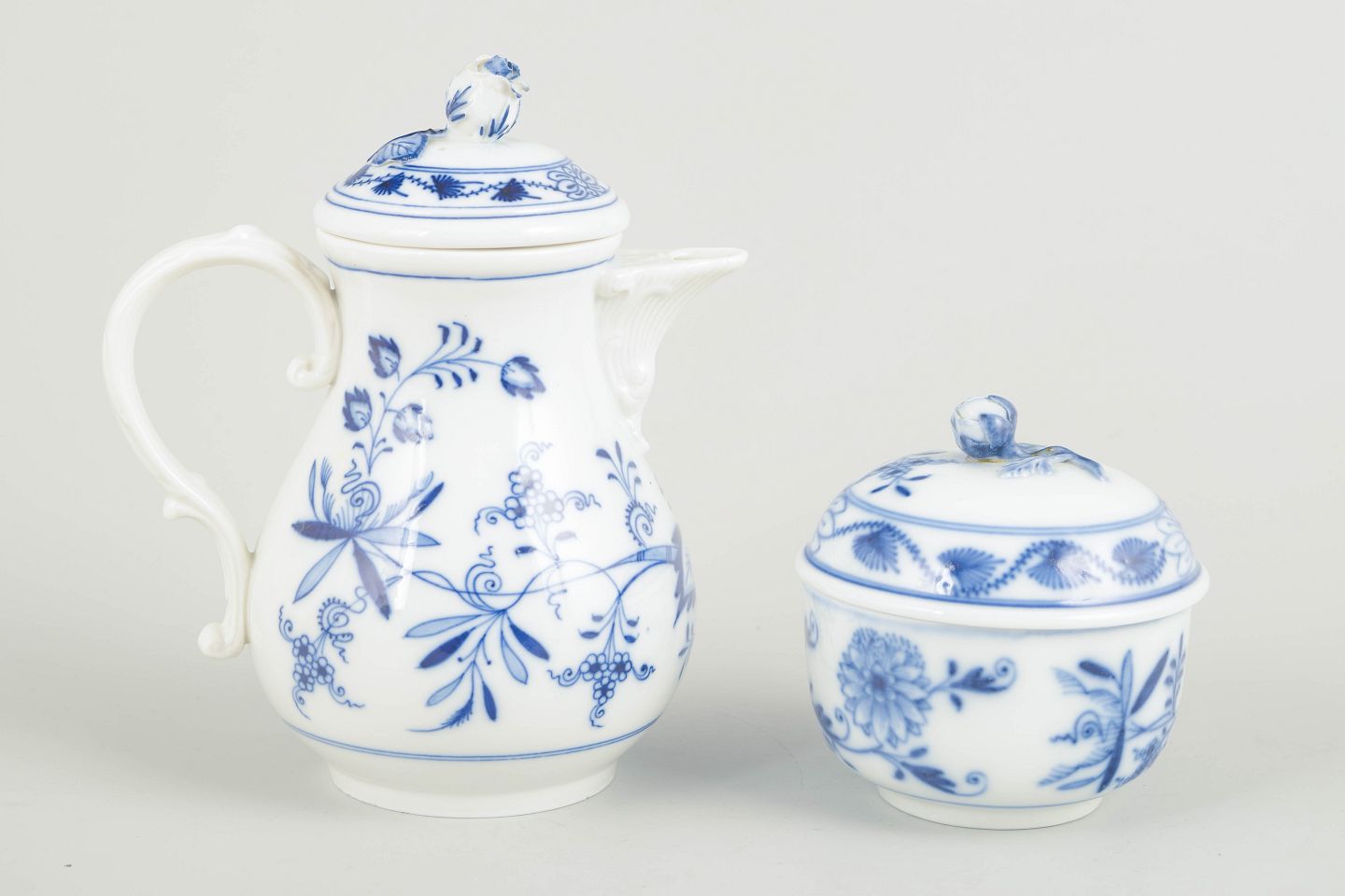 Hand-painted porcelain from Meissen’s iconic “Blue Onion” (Zwiebelmuster) series. The set consists of a small lidded sugar bowl and a demi-tasse pot with lid and handle, both decorated with the characteristic blue floral and foliate motifs.