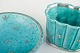 Skål og lille vase i klassisk turkis glasur med indlagte sølvdekorationer, karakteristisk for Kåges ikoniske Argenta-arbejder for Gustavsberg. Elegante, små formater med tydelig studiopræcision.