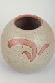 Hånddrejet stentøjsvase i afrundet, organisk form. Udført i Palms karakteristiske rå, taktile udtryk med en todelt, mat glasur: øverste del i lys, kalket tone og nederste del i støvet rosa. Et elegant og harmonisk eksempel på Palms mere minimalistiske arbejder fra perioden.