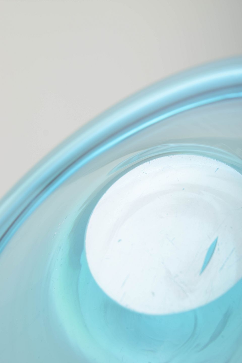 Organically shaped mouth-blown bowl in turquoise blue glass with thick walls and soft flowing contours, typical of Scandinavian glass design of the period.