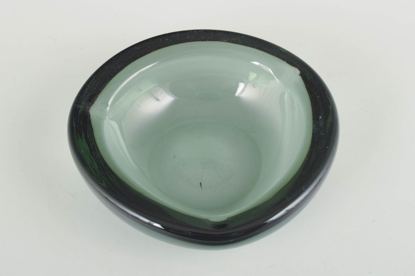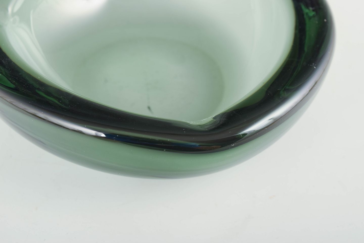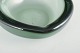 Organically shaped mouth-blown bowl in green glass with thick walls and soft, rounded contours, typical of Scandinavian glass design of the period.