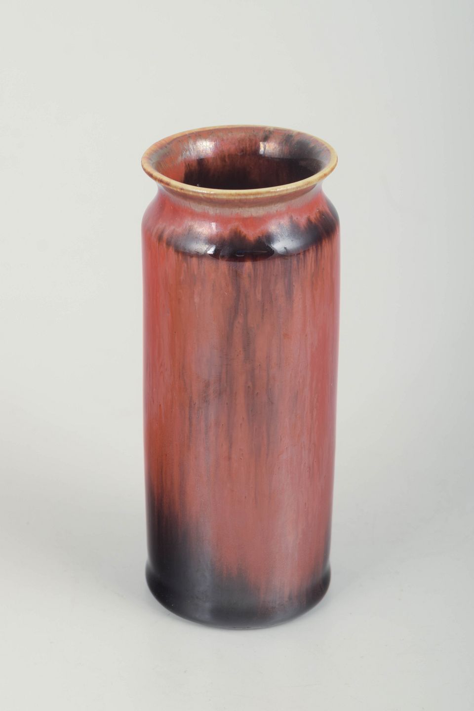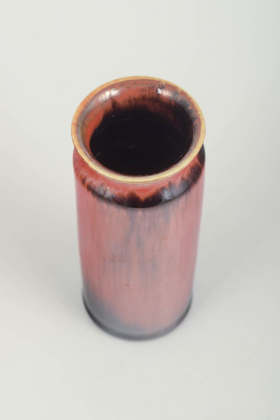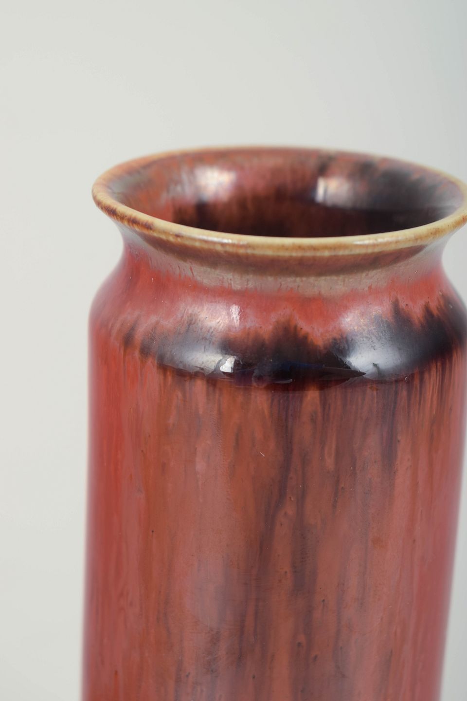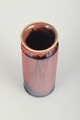 Cylindrisk vase i stentøj med afrundet skulder og udadbuet kant, dekoreret med rødbrun glasur med mørke løbende toner mod foden – et typisk eksempel på Stålhanes elegante formsprog og subtile glasurarbejde.