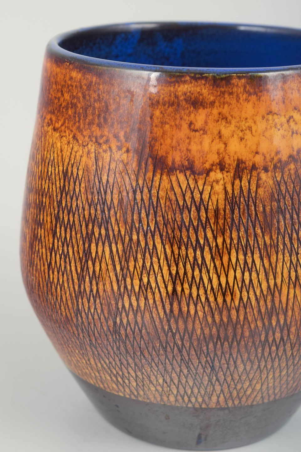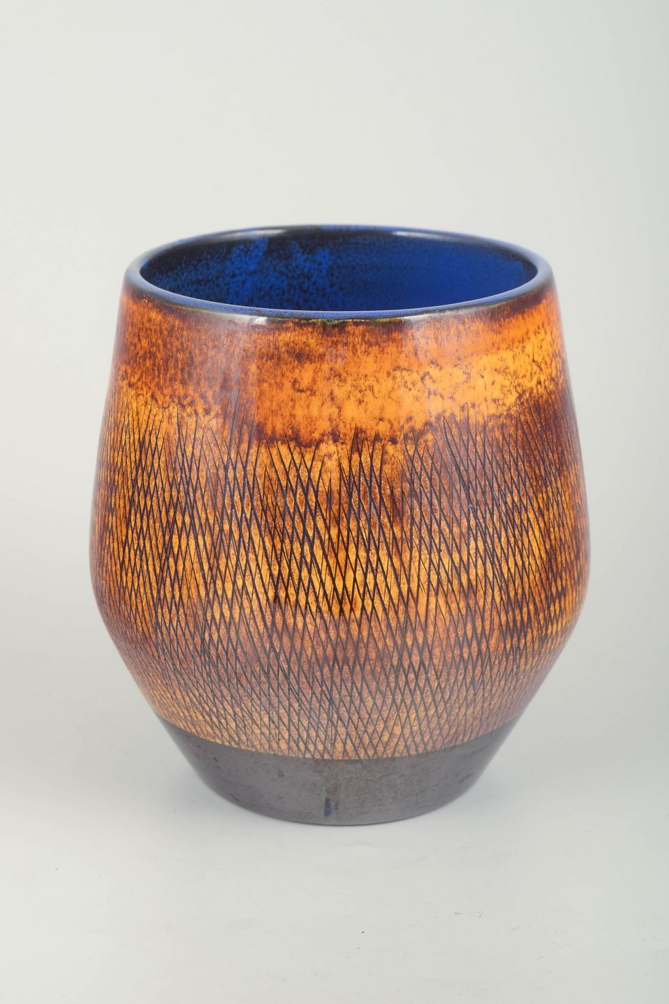 Decorative stoneware vase with characteristic orange and brown glaze featuring incised pattern and deep blue interior glaze. Model 2610.