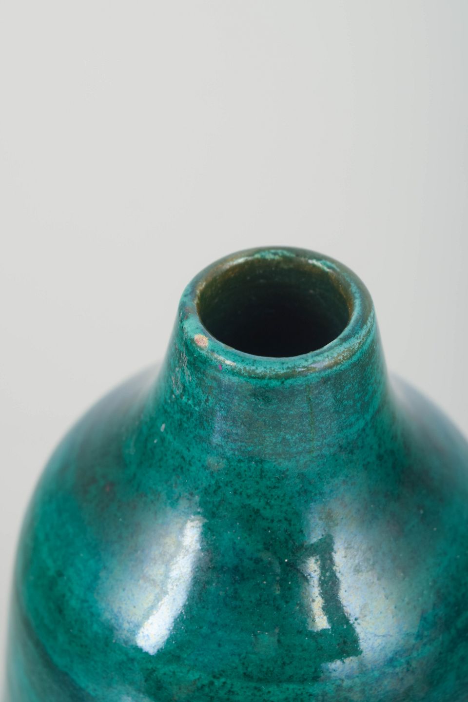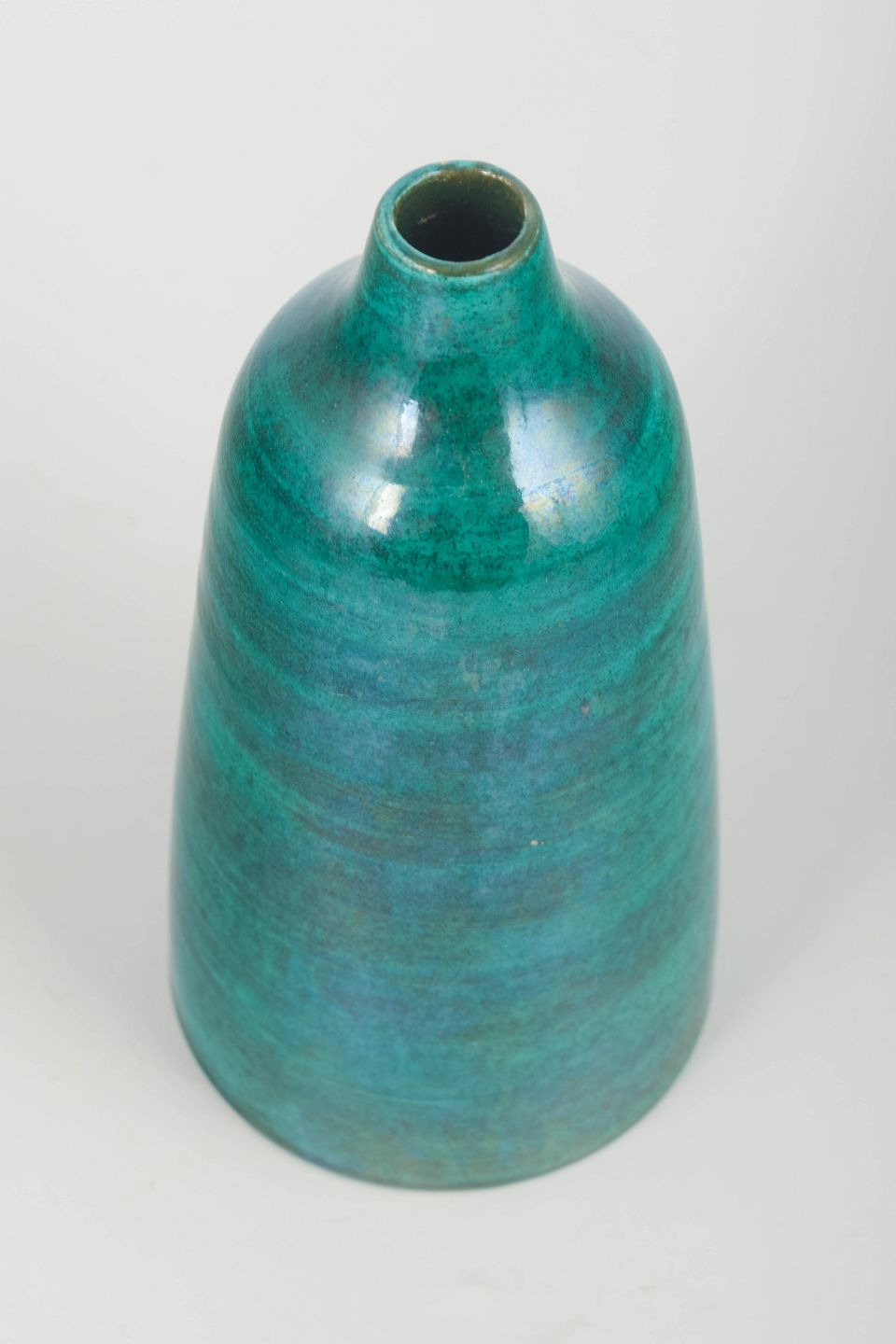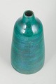Hånddrejet stentøjsvase med smal hals og dyb smaragdgrøn glasur med levende farvespil. Klassisk studiokeramik fra perioden med fokus på form og overflade.