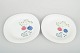 Sæt med to fajancetallerkener med karakteristisk grafisk dekoration i blå, grønne og røde toner. Begge i perfekt stand.