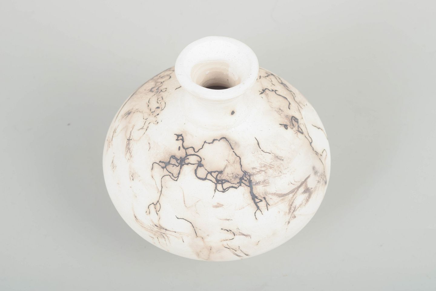 Unik hånddrejet vase i stentøj med lys glasur og karakteristisk marmoreret dekoration i brune og sorte nuancer. Blød, rund form med kort hals og lille åbning. Signeret.
