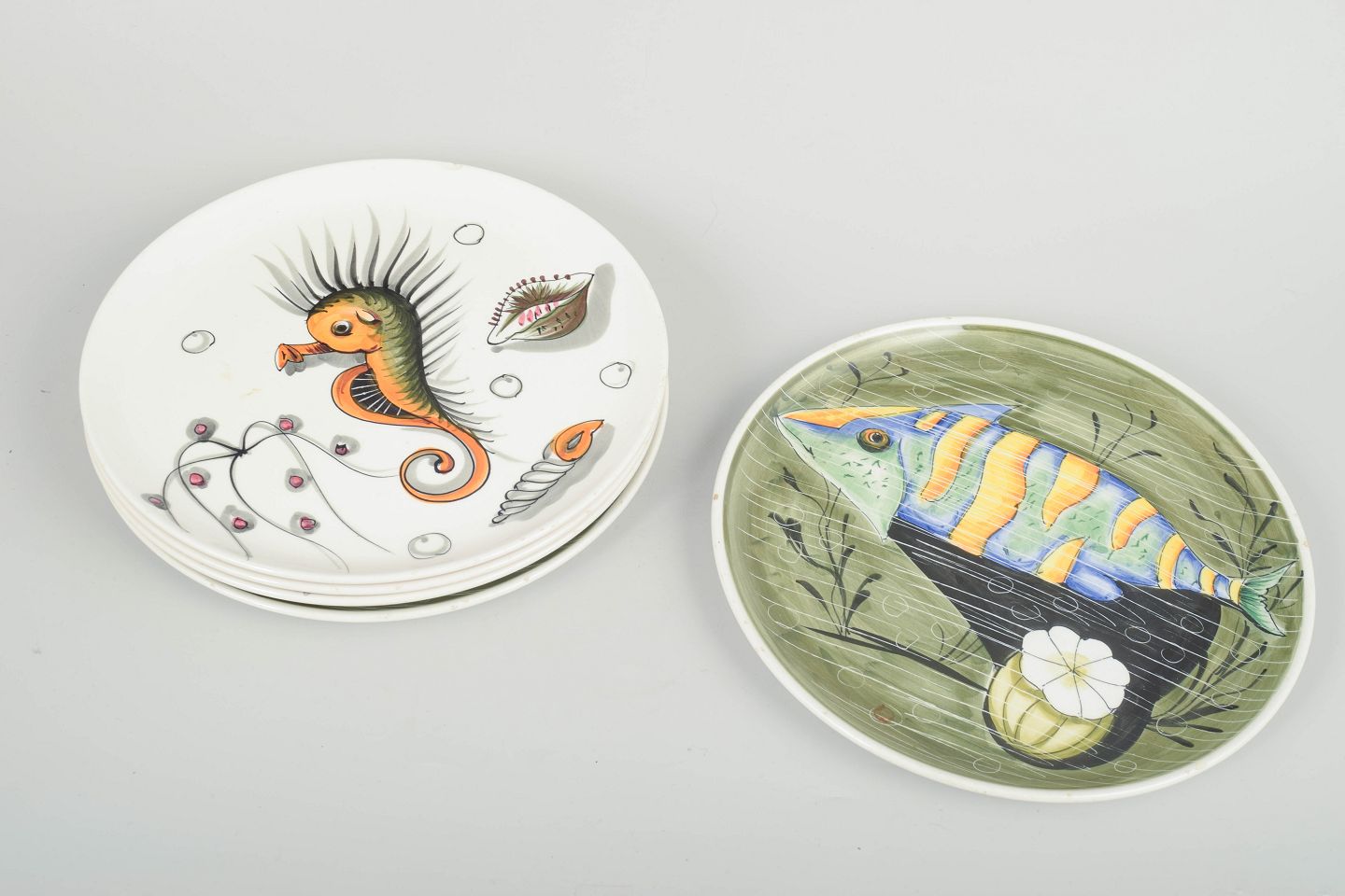 Sæt af fem hånddekorerede fajancetallerkener med farverigt motiv og klassisk italiensk formsprog. Enkelte små skår.