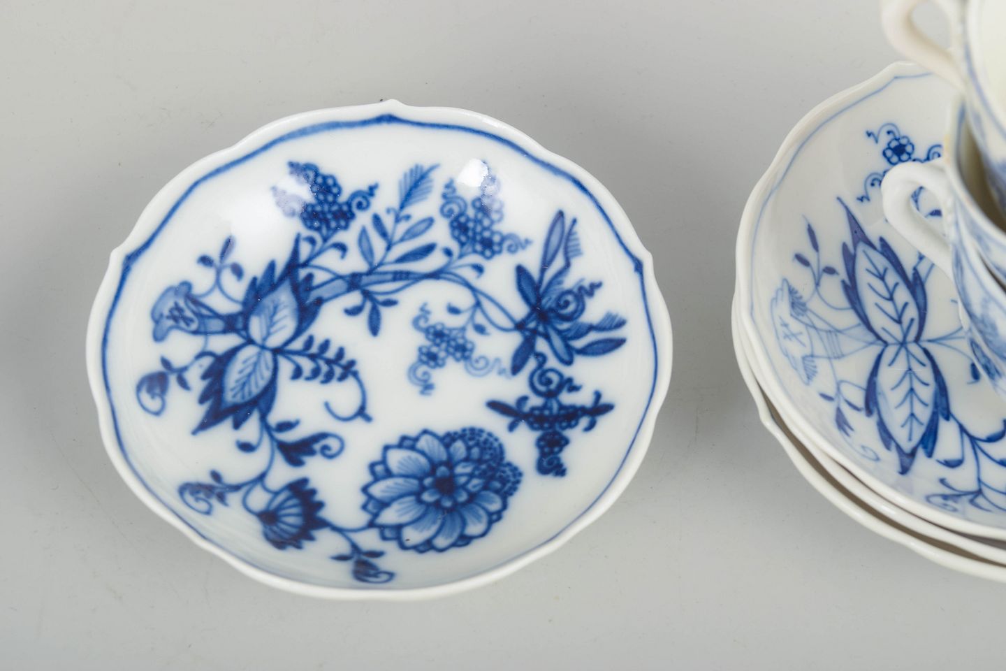 Meissen Blue Onion Pattern, four espresso cups with matching saucers.