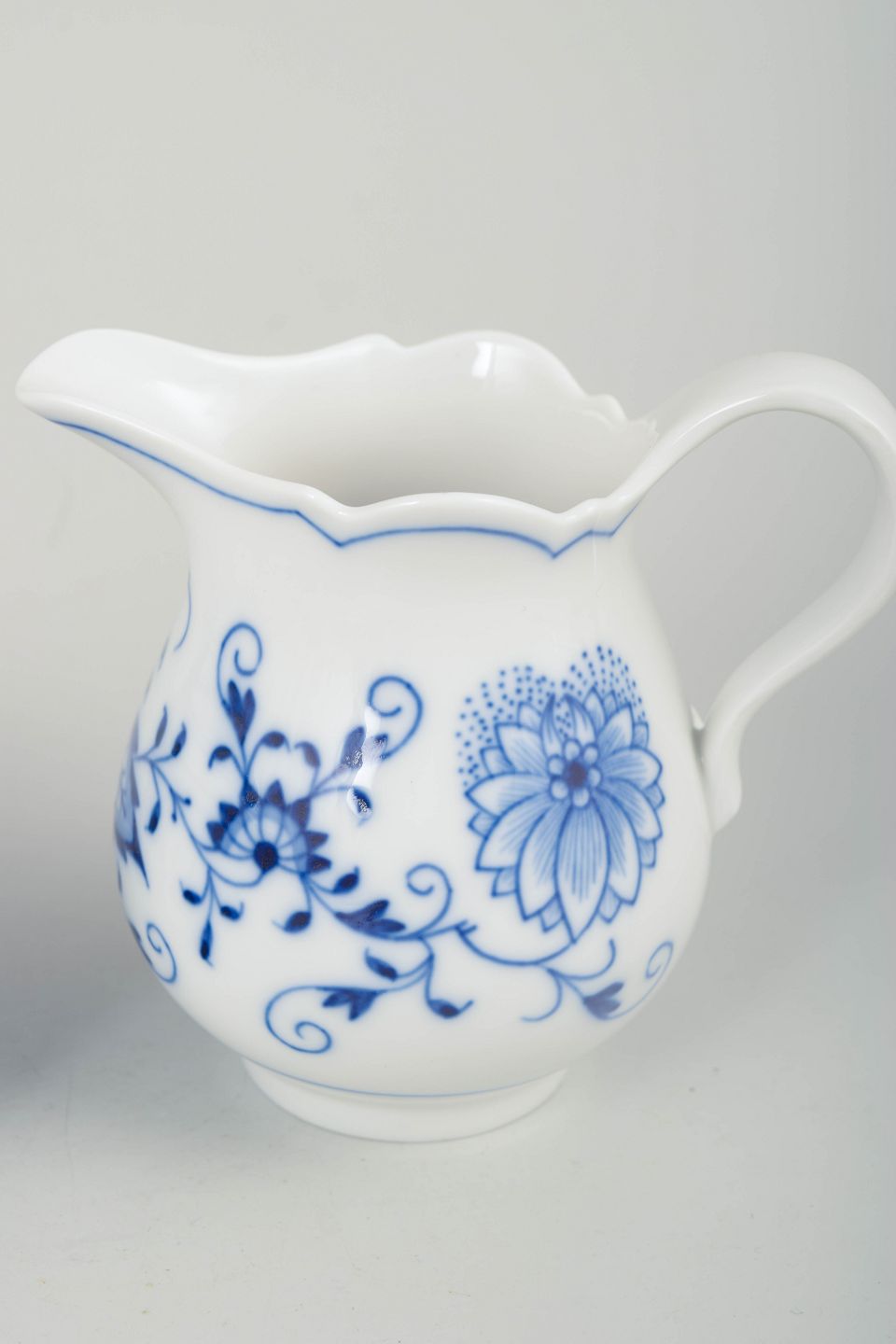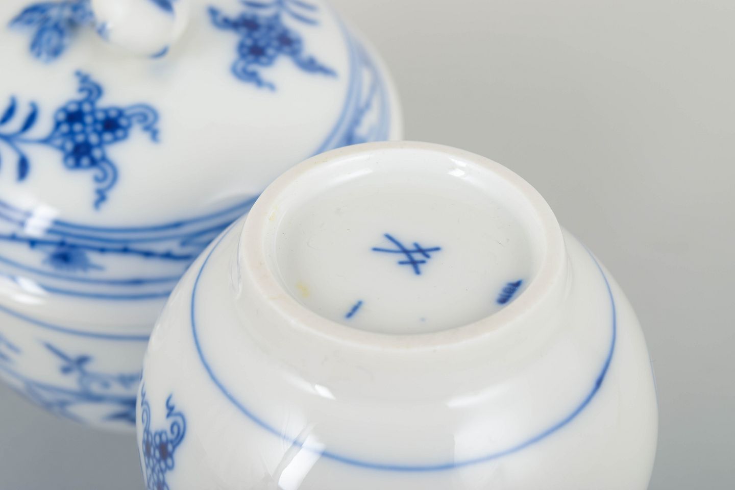 Meissens løgmønstret (Zwiebelmuster) har været blandt Europas mest anerkendte porcelænsdekorationer siden 1730’erne. Den koboltblå underglasur males i hånden og giver hver genstand sin egen let varierede karakter. Midt-1900-tals eksempler udmærker sig ved præcis penselføring og klassiske proportioner.