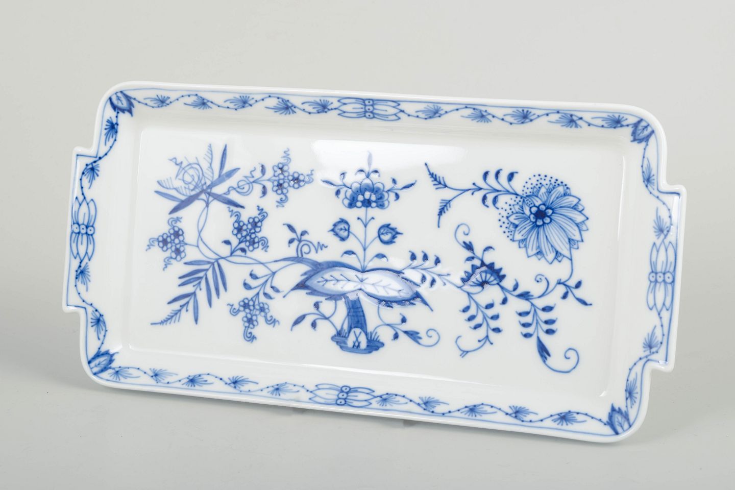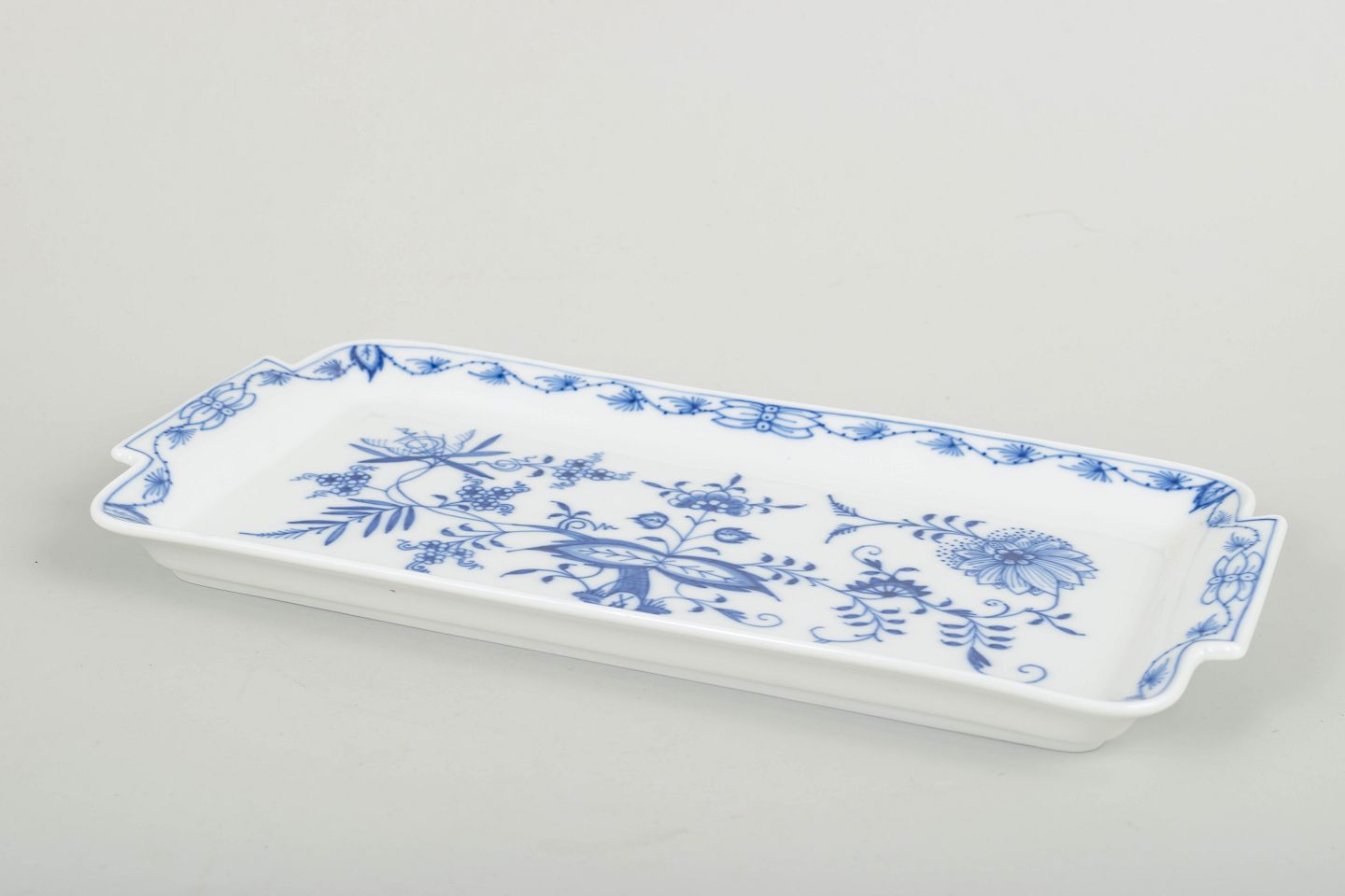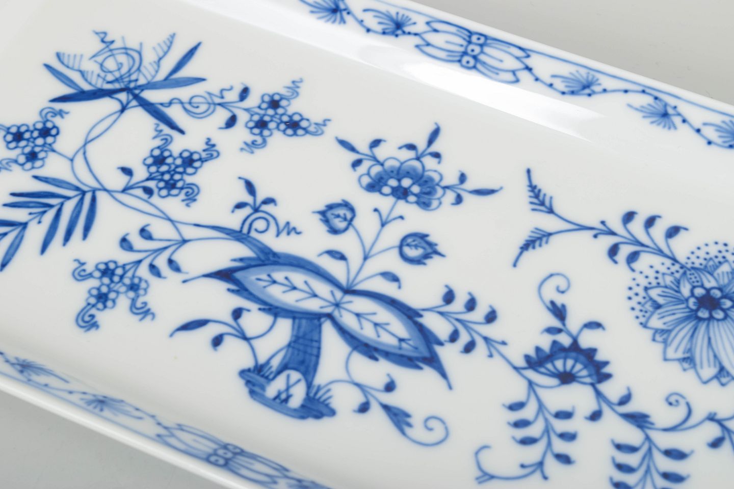 Rektangulært serveringsfad i det klassiske løgmønstret (Zwiebelmuster) med håndmalet blå underglasurdekoration og let buede greb.