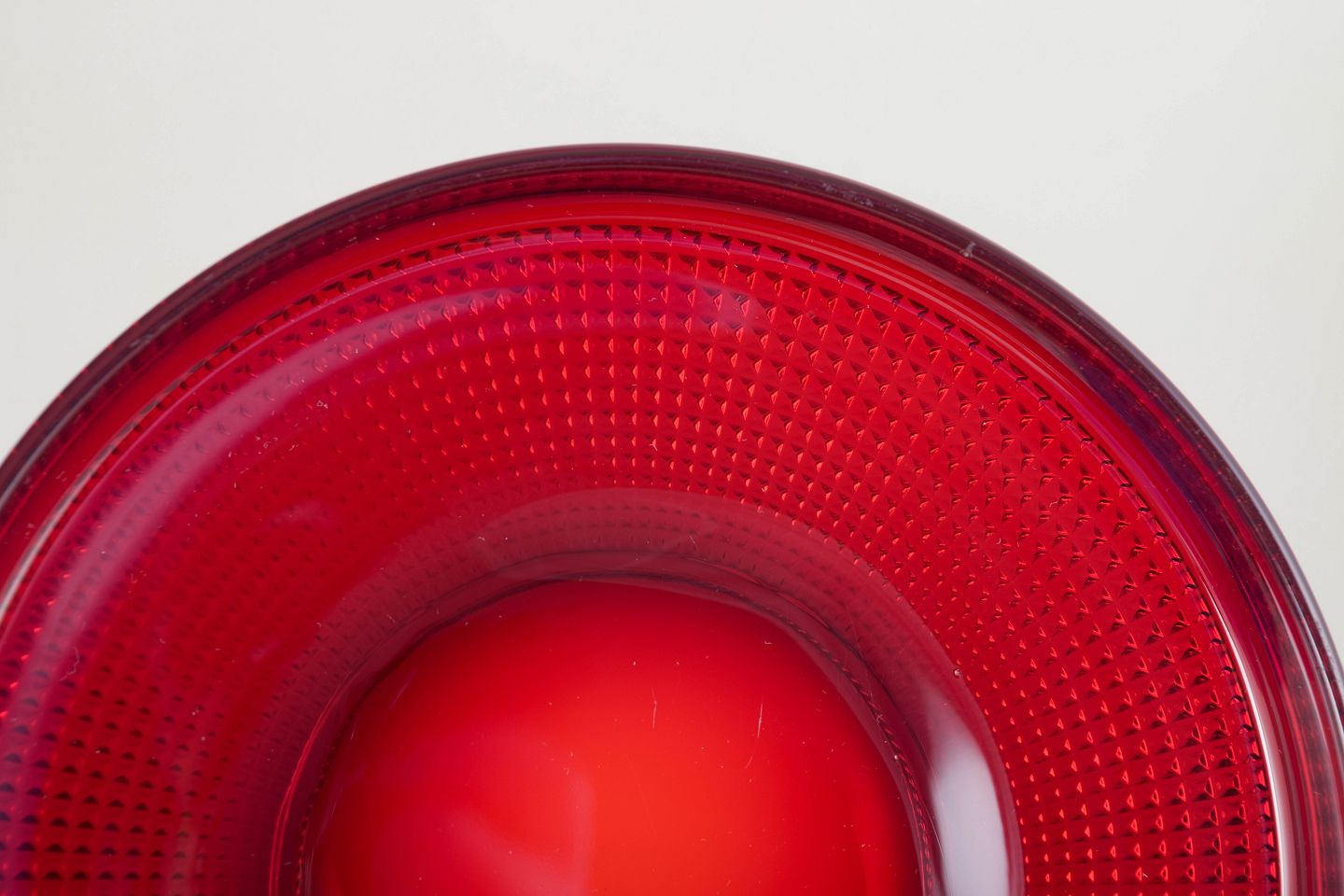 Sæt med fire flade tallerkener i rubinrødt glas fra Gullaskruf, model “Vineta”, karakteriseret ved den optiske prikketekstur og dybe, klare farve. Et markant og elegant eksempel på svensk glasdesign fra perioden.