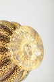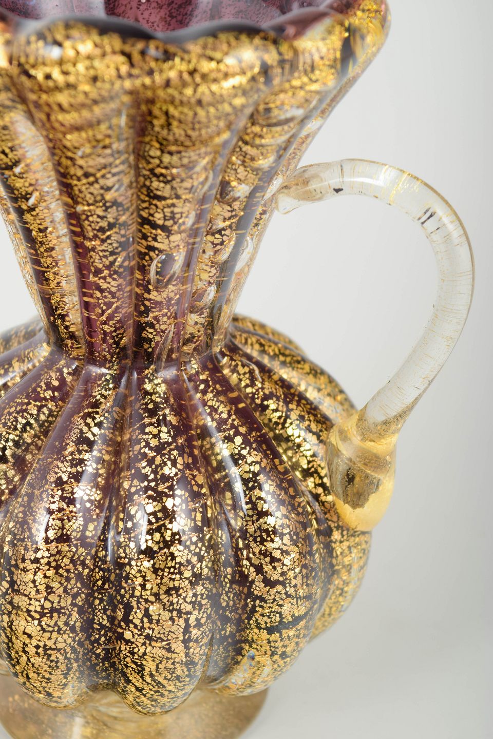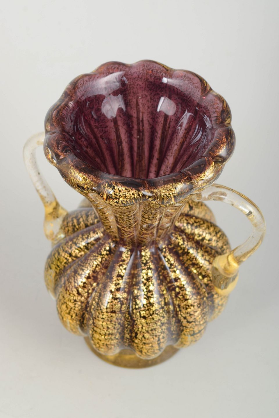 Dekorativ Murano-vase med riflede sider, to klare håndtag og indlagt guldstøv (aventurine). Farverig, skulpturel form med bølget kant.
