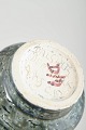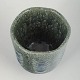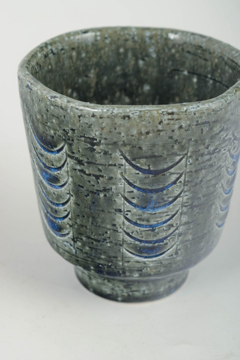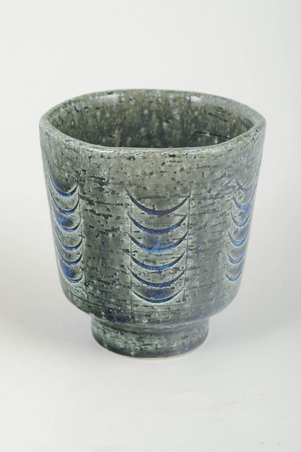 Small cylindrical stoneware vase with incised arc motifs in blue tones and the characteristic Palshus ash glaze. Signed.