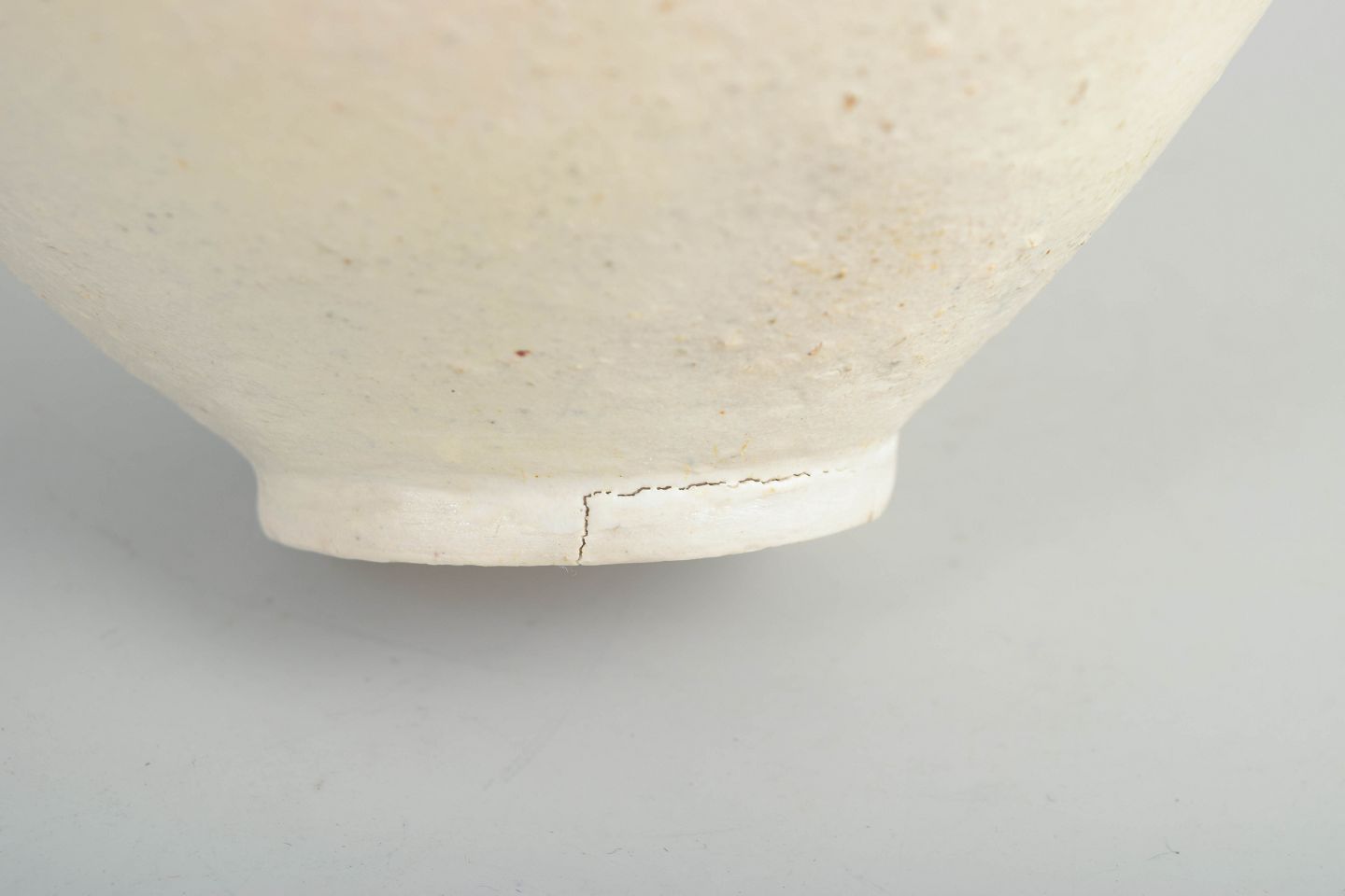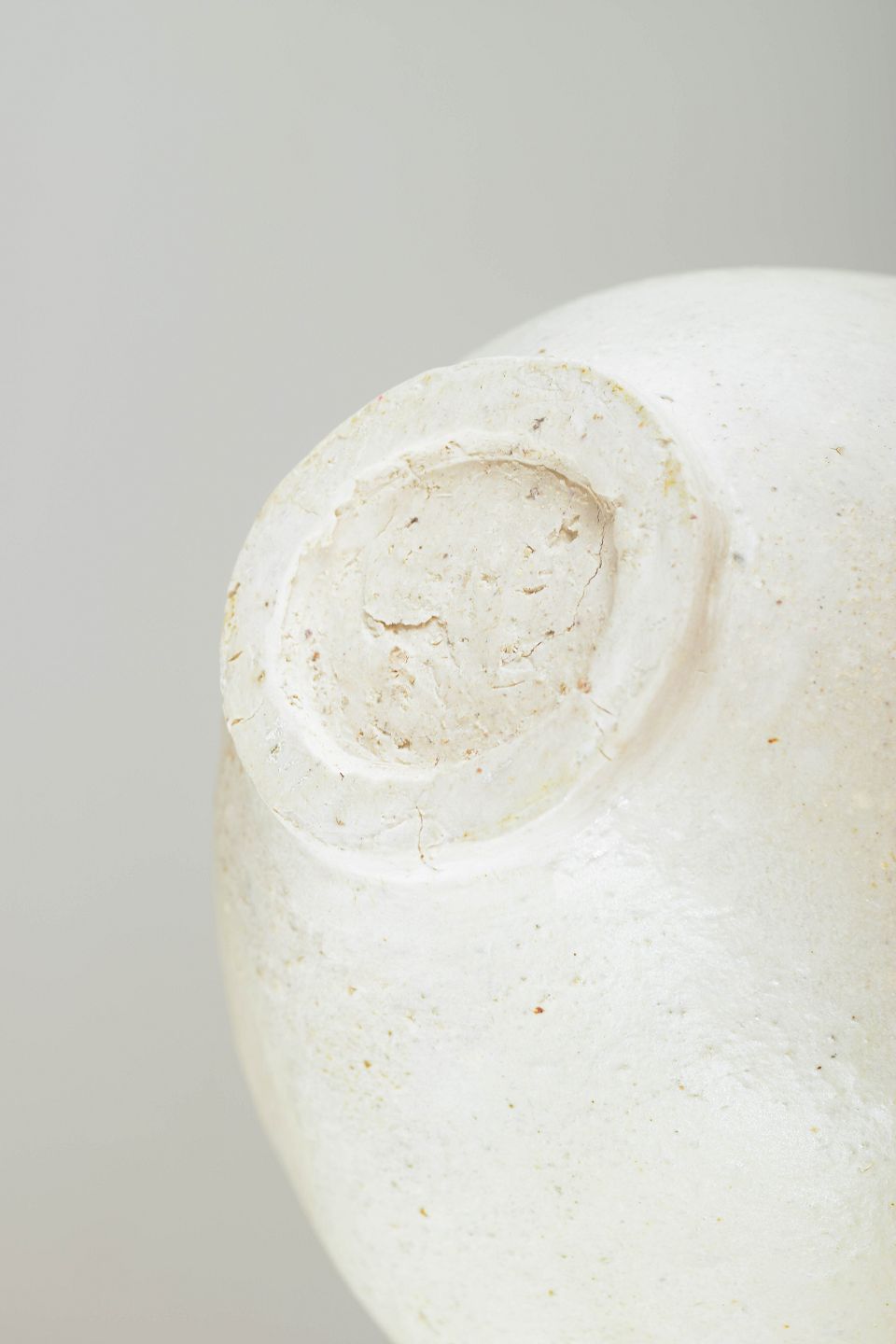 Sculptural, hand-built studio vase in stoneware with a subtly asymmetric form, raw white surface, and minimalist brushstroke decoration in dark brown and black tones. A distinctive and unique artistic ceramic work from the period.