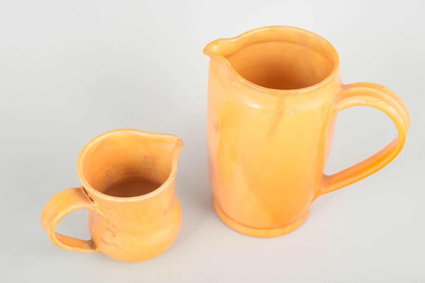 To store hånddrejede keramik-kander i Kählers karakteristiske gul-orange glasur fra 1930’erne. Begge med markante svungne hanke og blød cylindrisk form. Klassiske brugskrukker fra perioden.
