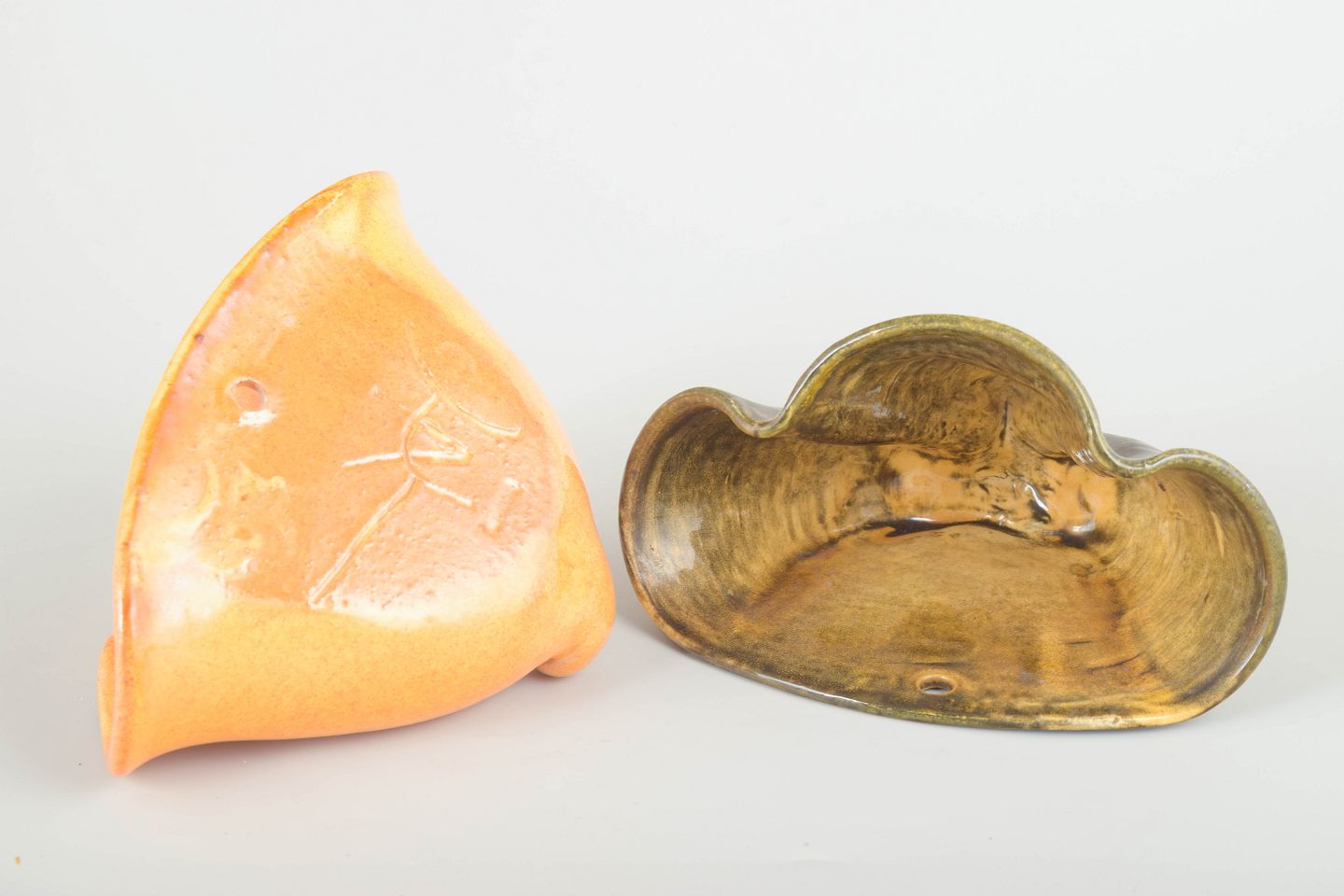 To dekorative væghængte urtepotter i formpresset keramik fra 1930’erne, udført i Kählers karakteristiske organiske formsprog. Den ene i varm orange-gul uran-glasur, den anden i brungrøn glasur med levende overfladespil. Begge med hul til ophæng.