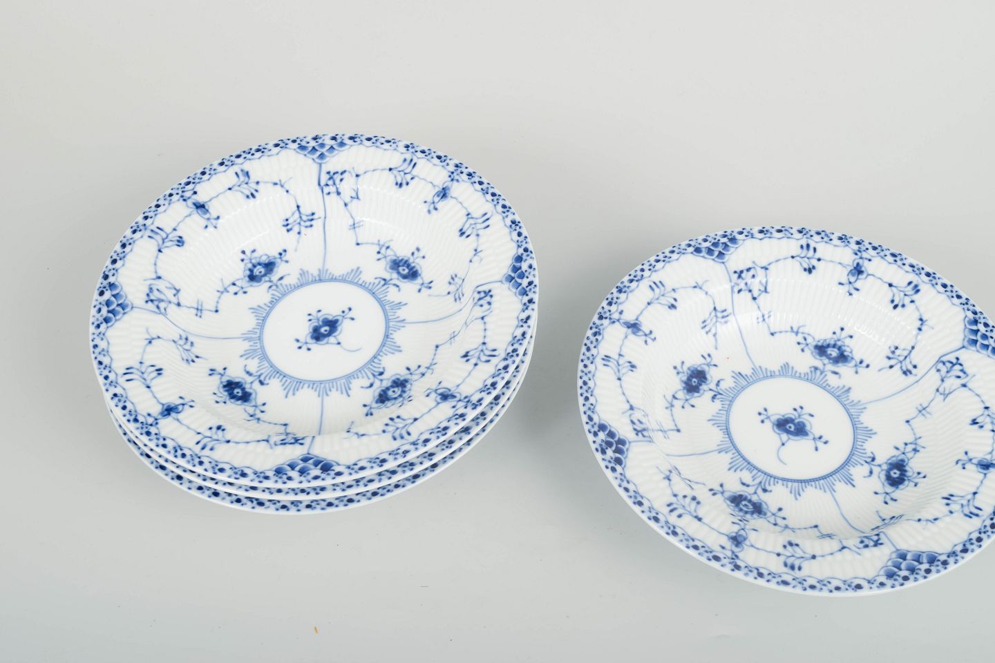 Four elegant deep plates in the Blue Fluted Half Lace porcelain series. Hand-painted with cobalt-blue decoration and featuring the characteristic lace border along the rim. Both plates are crafted in fluted porcelain, representing Royal Copenhagen’s classic late 20th-century quality.