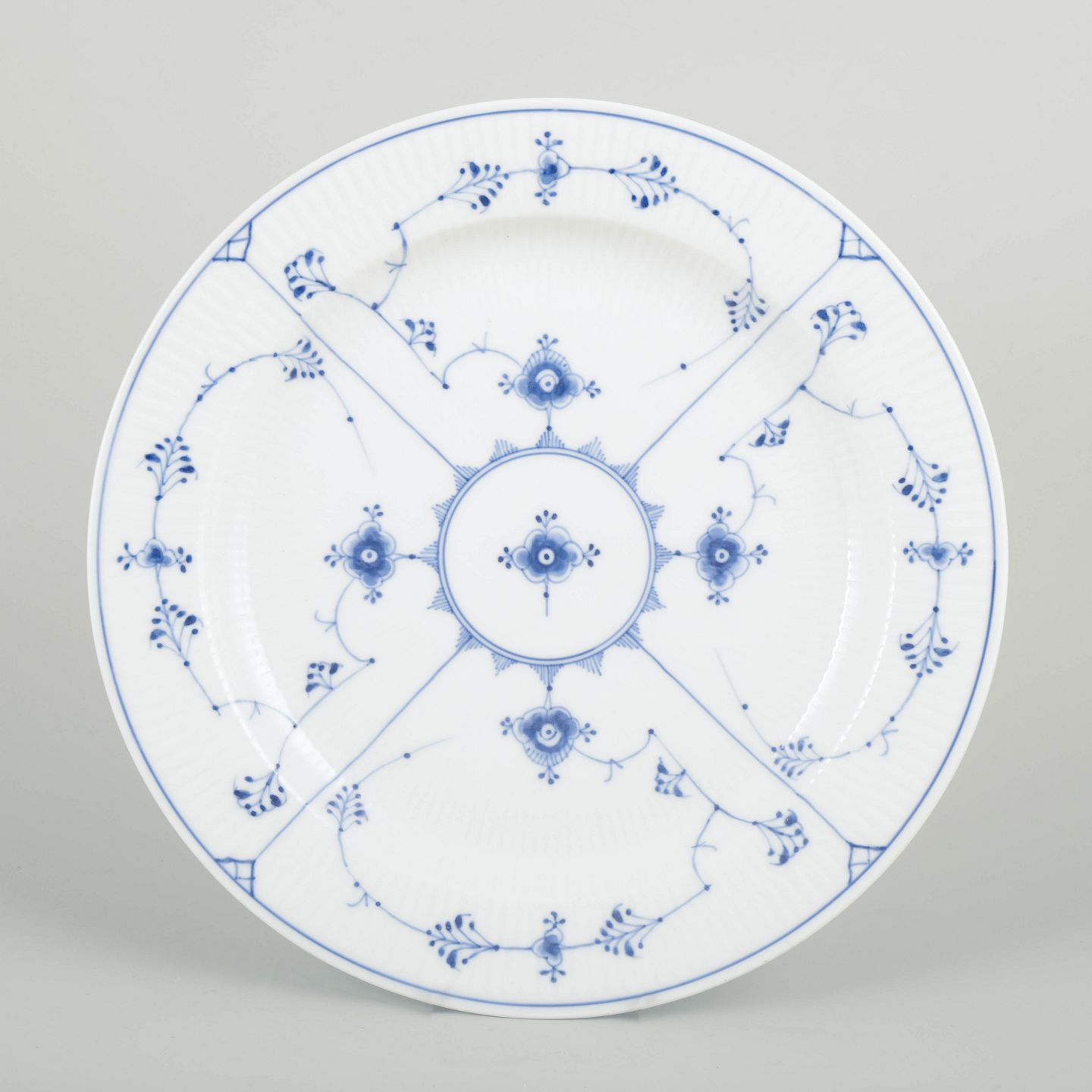 Stort og dekorativt serveringsfad i musselmalet riflet porcelæn, håndmalet i klassisk koboltblå på riflet korpus. Den brede, svungne form og det rige mønster gør fadet til et markant eksempel på Royal Copenhagens produktion i 1920’erne.